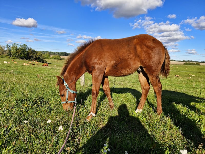 Ranch Horse trifft auf Cow Horse❤️ Frederick ist am 20.04.2025 geboren. In schicker chestnut Farbe überzeugt er mit seiner Coolness und seinem unkomplizierten Wesen Er kennt das Fohlen ABC, ist regelmäßig entwurmt, seine Papiere und Equidenpass sind beantragt Er wächst im Herdenverband im Offenstall auf, kennt Hunde und Kinder Endmaß ca 1,52m Über die Eltern N/N (könnte HERDA Einzelgenträger sein) Standort: 18574 Gustow ( Insel Rügen)