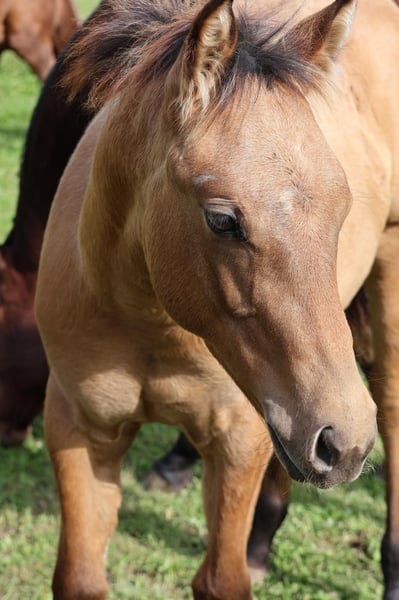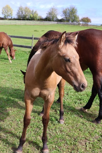 Dusty est un beau poulain étalon Quarter Horse, né le 8 mai 2025. Taille estimée de 150 à 153 cm, 5 Panel et MYHM par les parents N/N. Il sera manipulé avec un licol jusqu'au sevrage et connaîtra les bases du poulain. Il est habitué aux enfants, aux chiens et aux tracteurs et grandit dans un troupeau de juments avec d'autres poulains. Dusty sera régulièrement vermifugé. Le COR de l'AQHA est disponible et le passeport équin est en cours de demande.