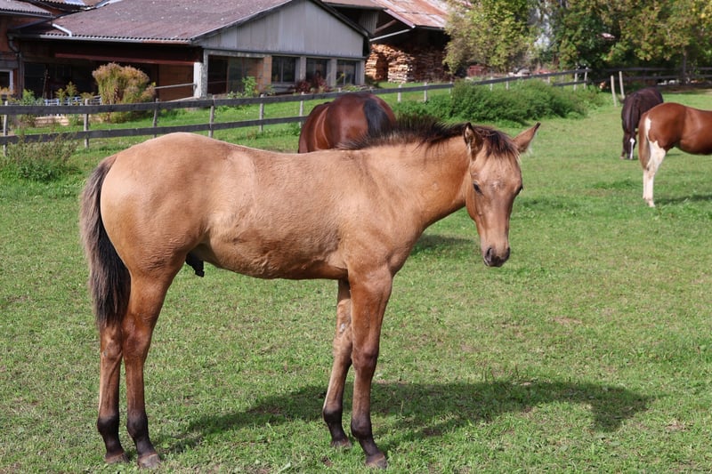 Dusty ist ein schönes Quarter Horse Hengstfohlen,geboren am 8.5.2025. Geschätzte Grösse von 150-153 cm,5 Panel und MYHM über die Eltern N/N. Er wird bis zum absetzen halfterführig sein und das Fohlen ABC kennen. Kennt Kinder,Hunde und Traktoren und wächst in einer Stutenherde mit anderen Fohlen auf. Dusty wird regelmässig entwurmt. COR von der AQHA ist vorhanden und der Equidenpass beantragt.