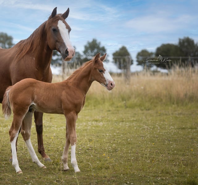 Angeboten wird ein vielversprechendes Hengstfohlen direkt vom Züchter. Daten: Geboren: Juni 2025 Rasse: AQHA (American Quarter Horse) Farbe: Fuchs/sorrel Abstammung: Gunners Chic Magnet x Coeur D Wright Stuff Genetik: 5-Panel getestet N/N NRHA Germany einbezahlt bei Abgabe Beschreibung: Dieses Hengstfohlen überzeugt durch sein herausragendes Exterieur, seine erstklassige Blutlinien und sein korrektes Fundament. Er zeigt bereits jetzt sehr schöne, elastische Bewegungen und verspricht das Potenzial, ein echter Blickfang im Sport zu werden. Er wächst artgerecht im Herdenverband mit Gleichaltrigen auf und wird bestens sozialisiert. Er kennt sowohl Offenstall- als auch Boxenhaltung und ist dadurch vielseitig auf die Zukunft vorbereitet. Im täglichen Umgang zeigt er sich brav und menschenbezogen: halfterführig, gibt zuverlässig die Hufe – auch beim Hufschmied – und ist neugierig sowie lernfreudig. Abgabe: Ein Auszug ist ab Anfang Dezember 2025 möglich. Preis ist VB - bitte realistische und faire Preisvorstellungen. Für weitere Fragen oder Bilder, gerne melden! Kontakt: Gerne beantworte ich weitere Fragen telefonisch oder per Nachricht. Besichtigung nach Absprache jederzeit möglich.
