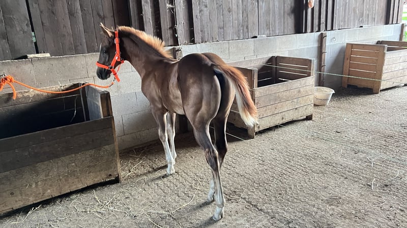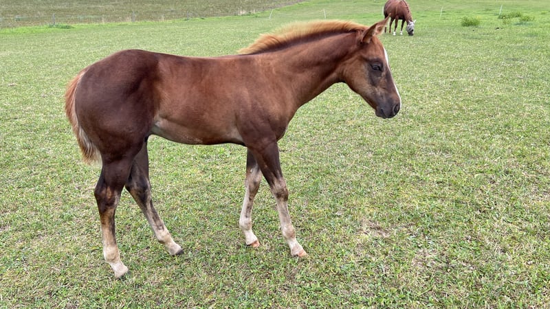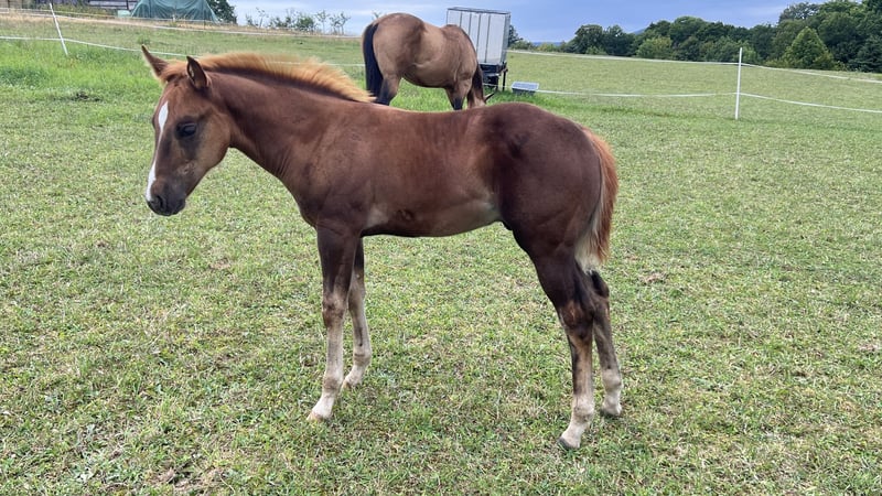 We are looking for the best home for our little one. He is very affectionate and loves to cuddle with people. He is already halter trained, picks up his hooves well, and goes out on trails as a companion horse. He is accustomed to standing tied, allows grooming and handling everywhere. He is familiar with dogs, cats, tractors, road traffic, and crossing rivers. He is regularly presented to the farrier, and the veterinarian is also no problem. His body is correctly built, muscular, he moves very well, and shows a natural talent for reining maneuvers. The little one is a grandson of Wimpys Little Step. His mother is from Time For Heida/Acres Of Time. He is growing up in a paddock with large pastures in a small herd. He is 5 Panel negative. He will be microchipped, receives full USA papers, and an equine passport. He can move to his new home in November. His father is Great Little Step - last picture.