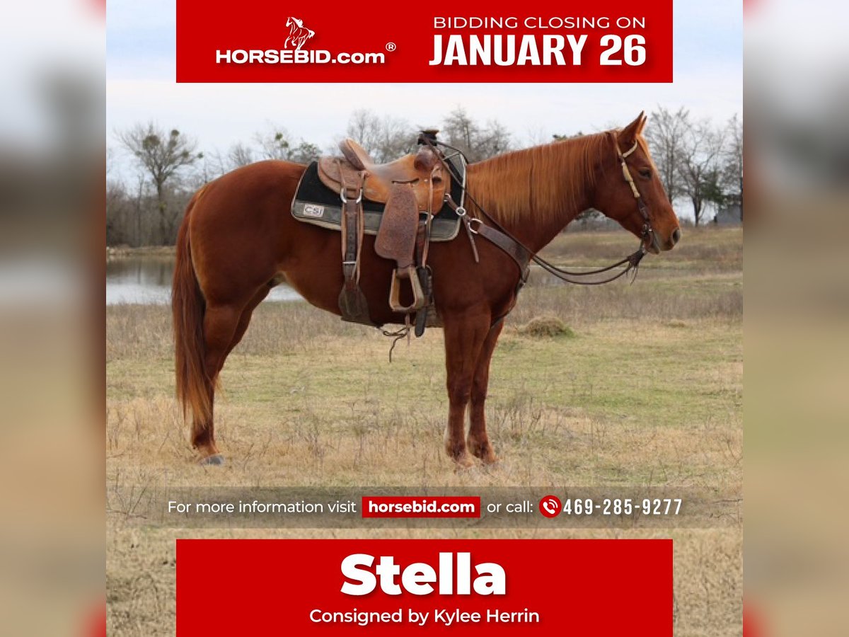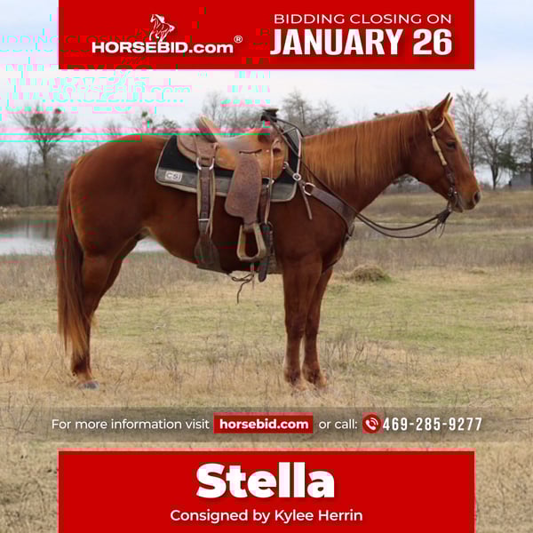 𝐉𝐀𝐍𝐔𝐀𝐑𝐘 ⭐️𝑨𝒍𝒍 𝑺𝒕𝒂𝒓 𝑳𝒊𝒏𝒆𝒖𝒑⭐️ Happening now thru MONDAY | JANUARY 26th - Available EXCLUSIVELY on HorseBid's website! For more details and to register visit: www.Horsebid.com CONSIGNOR CONTACT: Kylee Herrin 469-285-9277 LOCATION: Terrell, TX BREED: Quarter Horse REGISTERED: Yes REGISTERED NAME: TMS ROYAL PRINC 033 COLOR: Sorrel HEIGHT: 14.3 AGE: 10 GENDER: Mare TMS ROYAL PRINC 033 “Stella” is an eye catching 10 year old mare standing 14.3 weighing 1100 pounds of pure sweetheart. Talk about one that’s all there and a power house of a horse. She is a seasoned rope horse with the heart, mind and skills to do it all. Stella is great in a stall or turned out and gets along with everyone. She is soft in the face, one-hand neck reins, moves off leg pressure, stops hard, and rates cattle with ease. She is safe for all levels but has enough motor skills and athletic abilities for advanced riders. Stella is experienced on the head and heel side. She has been hauled and won on at the jackpots. She stands in the box and leaves off your hand. She been roped on by a 4 header as well as a 8+ header. She has all the speed you need for any roping. Stella is consistent and has a nice move in the corner. She loads easy in the trailer and stands quietly tied. Stella has done all aspects of ranch work such as pushing, gathering, roping and sorting cattle. She will go wherever you point her and does it with ease. She crosses water and logs or anything in front of her with no hesitation. This horse is kind, honest, and has the sweetest personality who gives 100% with everything she does. Stella is my go to horse for just about anything. I can’t say enough good things about her. She’s always been sound and healthy. She is up to date on worming, teeth, shoes and coggins. Located in Terrell TX. FMI call Kylee 469-285-9277
