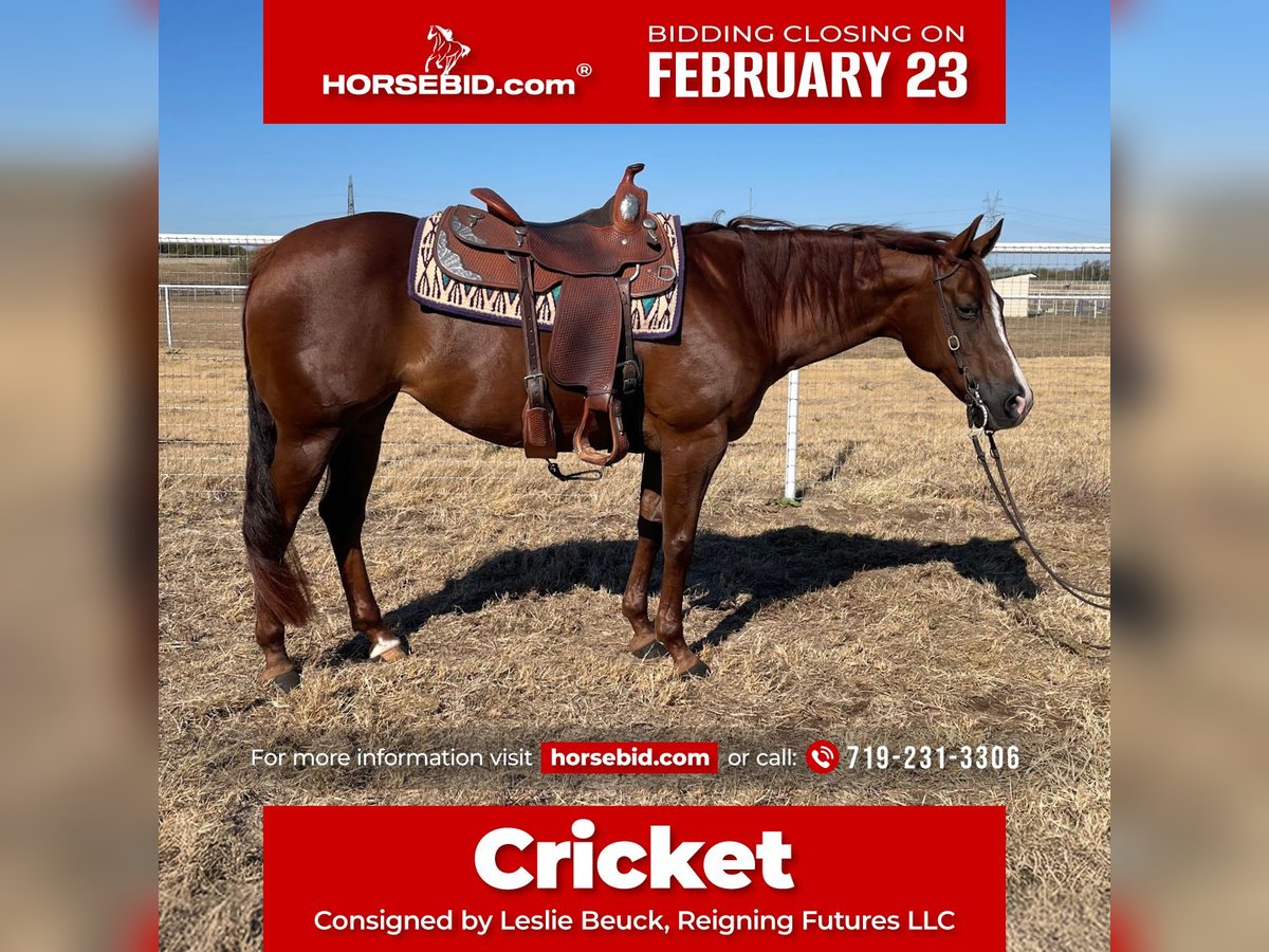 💎 𝐓𝐇𝐄 𝓓𝓲𝓪𝓶𝓸𝓷𝓭 𝐒𝐇𝐎𝐖𝐂𝐀𝐒𝐄 💎 Happening now thru MONDAY | FEBRUARY 23rd - Available EXCLUSIVELY on HorseBid's website! For more details and to register visit: www.Horsebid.com CONSIGNOR CONTACT: Leslie Beuck, Reigning Futures LLC 719-231-3306 LOCATION: Burleson, TX BREED: AQHA REGISTERED: Yes REGISTERED NAME: Be My Lucky Cricket COLOR: Chestnut HEIGHT: 15 AGE: 10 GENDER: Mare A granddaughter of the legendary reining stallion Wimpy’s Little Step, this sweet girl is a great all-around riding partner with a quiet disposition and a versatile foundation. She’s been ridden both Western and English, has experience with small jumps and cross-country, and is a confident trail horse. She’ll walk easily through water and over tarps, and you can stand on her and slide off her butt without phasing her. She has been in training in our reining program the past few months, improving quickly in her general body control and loping frame. However, she is not finished in reining maneuvers. This mare would make a fantastic partner for a confident, older youth or an adult looking for a versatile horse to enjoy. Head to some open shows or play days, enjoy the trails, or just go for a pleasant lope in the arena. The choice is yours with this sweet, quiet mare. At approximately 15 hands and 1200 pounds, Cricket is a nice, comfortable size. Up to date on farrier, deworming, and vaccinations. If you have further questions, please contact Leslie Beuck at (719) 231-3306.