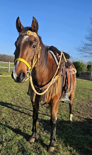 Kucica Quarter Horse z dokumentami TENDER HOPE 9 lat wzrost 1,52 m w trakcie AKU posiada paszport E- – spokojna podczas jazdy i w codziennym kontakcie – przyjazna i zrównoważona – chętna do kontaktu z ludźmi i łatwa w obsłudze – zna stajnię otwartą i utrzymanie w stadzie – gotowa na dalsze zadania w rekreacji Idealna do: rekreacji, przejażdżek i dla rodzin z doświadczeniem w jeździe konnej Nasze konie: – regularnie odrobaczane – pod opieką kowala i osteopaty Sklep na gospodarstwie: Siodła westernowe, uzdy, akcesoria Transport i akcesoria dostępne w korzystnych cenach na życzenie Nasza oferta: ✅ 3-miesięczna gwarancja wymiany ✅ Jazda próbna: 35 €, każde kolejne konie 25 € (w dniu zakupu odliczane od ceny) ✅ 100 € natychmiastowego rabatu przy odbiorze/transporcie tego samego dnia ✅ Indywidualne i szczere doradztwo Zapytania wyłącznie telefonicznie: 0171 – 4001968 Dostępny codziennie od 8:00 do 20:00 ⚠️ Brak kontaktu przez e-mail lub WhatsApp ⚠️ Wszystkie informacje bez gwarancji