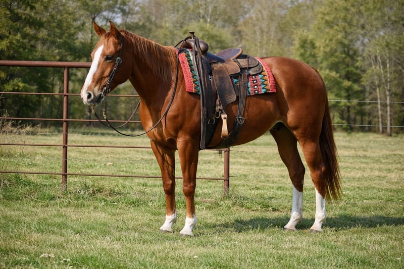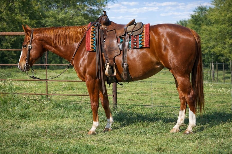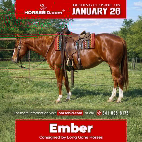 𝐉𝐀𝐍𝐔𝐀𝐑𝐘 ⭐️𝑨𝒍𝒍 𝑺𝒕𝒂𝒓 𝑳𝒊𝒏𝒆𝒖𝒑⭐️ Happening now thru MONDAY | JANUARY 26th - Available EXCLUSIVELY on HorseBid's website! For more details and to register visit: www.Horsebid.com CONSIGNOR CONTACT: Long Gone Horses 641-895-8175 LOCATION: Sulphur Springs, TX BREED: Quarter horse REGISTERED: Yes REGISTERED NAME: “JOLYN PALLYS SKY” COLOR: Sorrel HEIGHT: 15.1 AGE: 10 GENDER: Mare 🔥From Trails to Town to Cattle— Ember Does It All🔥 “JOLYN PALLYS SKY” (A.K.A as Ember) is a 2016 model AQHA mare standing 15.1 hands tall. This girl is built to last with a good bone structure and put together conformationally correct all the way around. She’s all chromed up making her a head turner everywhere you go. Ember is straight forward-no drama- get any job done. She stands tied well, tacks up easy, loads and unloads with no issues. She picks up all 4 hooves, stands to be grommed, good with baths, and easy for the vet. Ember is a tried and true trail horse. She will walk over big logs, go through deep water, and goes up and down steep hills. She is sure footed and can handle even the most intense trails with no quit to her. Ember has also been used to work cattle, from sorting pairs, moving to different pastures, and loading the trailers she is reliable for every job. In the arena Ember will walk, trot, and lope when asked, great stop and turns around easy. She has dabbled around in some fun shows with our advanced kids and they have really enjoyed her. Ember has also been rode down town and walks with ears forward happy to be there one foot in front of the other like she means business and looks good doing it. We do recommend an advanced beginner/intermediate rider for Ember. She isn’t hot or prancy but has a quick walk like she’s on salary pay and ready to get her job done therefore she may intimidate a timid rider but she is not mean or dangerous in ANY WAY! Ember is 100% sound she does not limp, can see out of both eyes, does not crib or weave, but she does have a very small hardly noticeable spot in her right eye. It won’t even pick up on a camera to show you but we want to be honest and call it for potential buyers. This is a very nice mare with the foundation breeding to back her up!