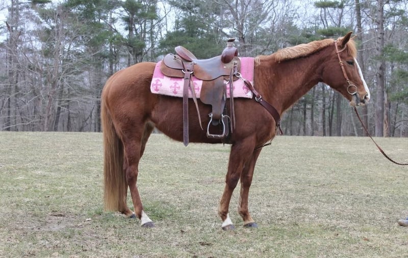 "AVAILABLE ON ONLINE HORSE AUCTION AT www DOT PlatinumEquineAuction DOT com BIDDING OPEN NOW thru SUNDAY | APRIL 26TH! *Final price will be determined on auction site* CONSIGNOR CONTACT INFO: Emily Wilmot 774-766-9910 LOCATION: Middleboro, MA ❤️Be Mine❤️ Be Mine “Heart” is an 11yr old 14.2h chestnut grade QH mare. She is cute and compact- the perfect size for both kids and adults. She is a complete love. meets you at the gate with a nicker every time. She could be handled by anyone on the ground. Heart has been a trail horse her whole life. She enjoys the slower pace, stop and smell the roses kind of rides. She will ride in the arena, but is very much a kick ride. She has a very comfortable trot and a great "woah". We have ridden her English and Western. She's even jumped small jumps. She is pretty much unflappable. I could see her being a versatility or therapeutic mount. She’d also be a wonderful trail partner. Heart is barefoot and not on any supplements. She’s happy living in the run in shed. Crossties, stands to be groomed and tacked. She does have an old , cold scar on her left hind cannon that doesn’t seem to affect her. Come meet this sweet girl! Contact Emily Wimot at 774-766-9910 for more information.