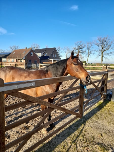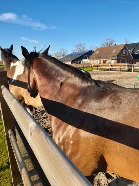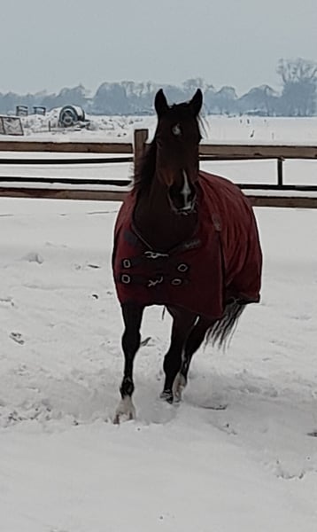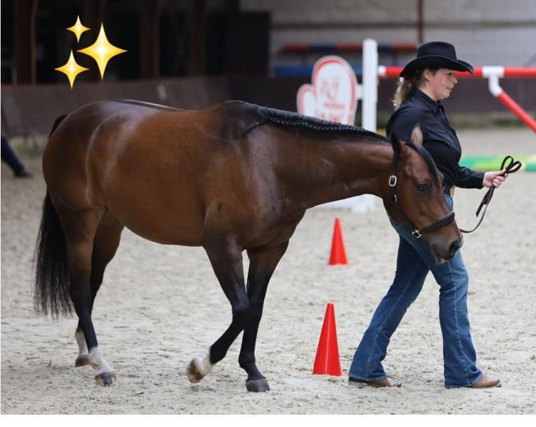 Quarterhorse merrie, van bijna 11 jaar, ingereden maar staat al weer een tijdje stil ( goed jaar) Kent grondwerk en de basis van het rijden, maar moet wel weer opgepakt worden. Beetje onzeker heeft wel bevestiging van een rustige ruiter nodig. Niet mee op buitenrit geweest maar aan de hand is ze heel rustig in het verkeer. Kan goed met andere paarden en in de kudde, geen merrie gedrag. Geen stal ondeugden, braaf bij smid en dierenarts, gaat makkelijk de trailer op. Super mooie fokmerrie met pannel 6 n/n Bij vorige eigenaar heeft ze een veulentje gehad. Bij interesse graag bellen, prijs is in overleg bij klik van beide kanten.