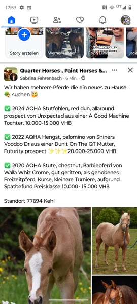 Verkaufe American Quarter Horse Stute – Perfekt für die Freizeit! Zum Verkauf steht eine wunderschöne American Quarter Horse Stute, geboren im Jahr 2015. Sie ist ein eleganter Palomino mit einem Stockmaß von 151 cm und begeistert durch ihre freundliches Wesen.. Sie hatte bisher drei wunderschöne Stutfohlen und zeigt sich als super Mutter! Diese vielseitige Stute eignet sich hervorragend für die Freizeitgestaltung, sei es für Ausritte, Spaziergänge oder wanderritte .. sie gehört eher zu den flotteren.. Sie ist gut ausgebildet, gelassen im Umgang und liebt es, Zeit mit Menschen zu verbringen. Bei Interesse oder weiteren Fragen stehe ich Ihnen gerne zur Verfügung. Ein persönliches Kennenlernen ist nach Absprache möglich. Kontaktieren Sie mich für weitere Informationen!
