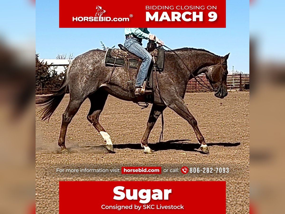 Sugar, y de 11 años, yegua AQHA de 15 manos, color roan rojo