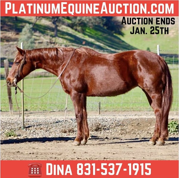 ONLINE AUCTION Place your bids at www.PlatinumEquineAuction.com Starting Bid $3500 Auction ends January 25th, 2026 Need a new saddle? Check out White Rock Saddles on our website or Facebook DAISY LOU 12 Years Old • 14.2 Hands • Sorrel Mare Daisy Lou is a gentle, safe, and well-broke mare suitable for riders of many levels. She has a kind heart, a steady way about her, and the type of mind that makes her enjoyable to own and ride every day. She is easy to get along with and uncomplicated to handle. Daisy Lou does well in a group pasture with other horses, stalls quietly, hauls well, and ties great for the vet and farrier. She is currently barefoot and requires no shoes, making her low-maintenance and straightforward. Under saddle, she is one-hand broke, stays collected, stops easily, backs willingly, and turns around smoothly. She walks, trots, and lopes comfortably, picks up her leads, and remains soft and responsive without being pushy or dull. On the trail, Daisy Lou is solid and relaxed. She’s happy to go wherever you point her—down the road, through town, or out exploring new places. She has been exposed to obstacles, flags, tarps, balls, and more, and takes everything in stride. Ride her bareback, ride her backward, take her to a parade, a small horse show, 4-H classes, or out working cows—she stays the same honest mare every day. Yes, she’s a sorrel, but she has plenty of heart, try, and reliability. Daisy Lou is an easy, honest mare that’s hard to fault. If you’re looking for something gentle, handy, and trustworthy, this is the one. Located in Paicines, California 📞 Longhorn Ranch Dina Cabral – 831-537-1915 Reputable shippers available to safely deliver her anywhere in the United States. ONLINE AUCTION Place your bids at www.PlatinumEquineAuction.com Starting Bid $3500 Auction ends January 25th, 2026 Need a new saddle? Check out White Rock Saddles on our website or Facebook