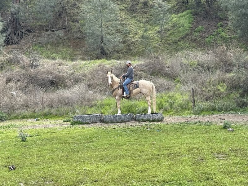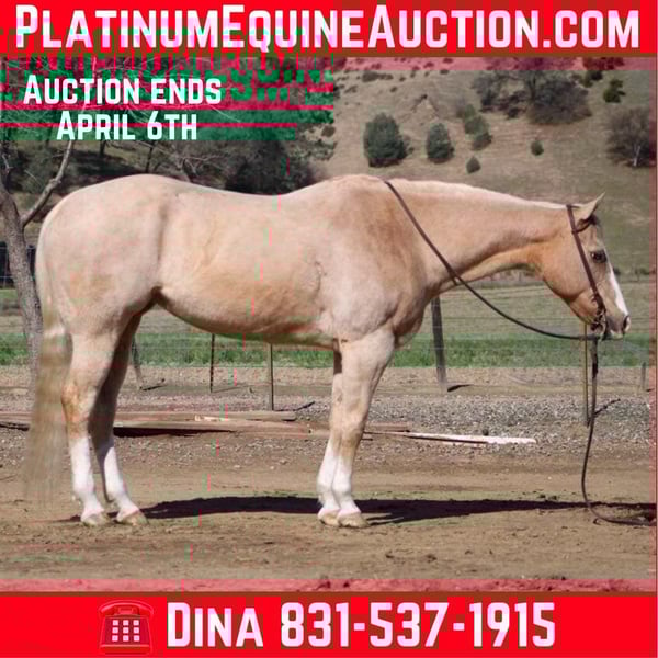 ONLINE AUCTION Place your bids at www.PlatinumEquineAuction.com Starting Bid $3500 Auction ends April 6th, 2025 Need a new saddle? Check out White Rock Saddles on our website or Facebook! April is a gorgeous palomino mare that will capture your heart with her stunning appearance and friendly personality. She stands at an impressive 15 hands tall and is 11 years old. With her wide blaze and four white socks, she is a sight to behold. Besides her striking looks, April is also a well-trained horse who knows how to get the job done. She has been trained to respond smoothly to cues and transitions in all three gaits – walk, trot, and most importantly, the lope. Her circles are pretty and controlled, making for a comfortable ride for any level of rider. April’s versatility doesn’t stop there – she excels in various tasks such as gathering cattle on the ranch or going out on trails. She has no fear of obstacles such as tarps, balls, or flying flags and will willingly go through whatever you ask of her. This reliability makes her a perfect choice for ranch work or trail riding. Not only does April have an impressive work ethic, but she also has an easy-going temperament that makes her pleasant to be around. Whether it’s grooming time or handling by the farrier, April behaves calmly without any fuss. Even when tied up or while being saddled up, she stands still with ease.What sets April apart from other horses is her genuine eagerness to please her rider. Every day, she greets you at the gate with enthusiasm and readiness to hit the trails together. She loves being with people and forms strong bonds with those who take care of her. Even in unfamiliar settings like town roads or alongside orchards and machinery, April remains calm and composed – making her an ideal horse for exploring new places without hesitation. Contact Longhorn Ranch located in Paicines CA 95043 contact Dina 831-537-1915 we guarantee that you will fall in love with this special horse upon meeting her! Don’t miss out on the opportunity to have such a treasure like April as part of your life. Contact us today and see for yourself why she is a standout horse that will bring you immense joy and cherished memories. ONLINE AUCTION Place your bids at www.PlatinumEquineAuction.com Starting Bid $3500 Auction ends April 6th, 2025 Need a new saddle? Check out White Rock Saddles on our website or Facebook!