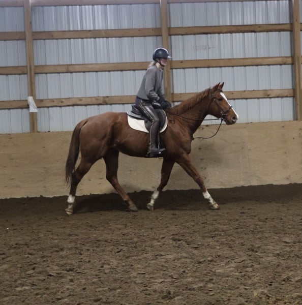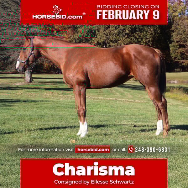 ❤️🔥𝑩𝒆 𝑴𝒊𝒏𝒆 𝐒𝐄𝐋𝐄𝐂𝐓❤️🔥 Happening now thru MONDAY | FEBRUARY 9th - Available EXCLUSIVELY on HorseBid's website! For more details and to register visit: www.Horsebid.com CONSIGNOR CONTACT: Ellesse Schwartz 248-390-6831 LOCATION: Howell, MI BREED: Appendix REGISTERED: No REGISTERED NAME: Charisma COLOR: Chestnut HEIGHT: 17.1 AGE: 12 GENDER: Mare Meet Charisma, I’m proud to introduce Charisma. She gets her name from her kind eye and quiet demeanor. This beautiful chestnut mare has a strong conformation, with her long legs and muscular build. Charisma is a 17.1hh appendix, mare who is 12 years old. She has been vaccinated, teeth floated, and is on a regular schedule with our farrier. She has lived much of her life on the trails, going all over Michigan in large groups, or out on her own. She went through woods, over logs, and through creeks. In the arena Charisma has become quite the hunter, as she's jumping around slow and steady at 2ft 9 with room to jump higher if her rider would desire. She has a smooth walk, floaty trot, and dreamy canter destined to catch eyes in the show ring. Charisma jumps knees to nose and even has automatic flying changes! She's a point and shoot kind of girl who will take care of her rider! She's not fussy if you are not accurate. She is very dependable, and level headed both on and off property. Charisma can take your kiddo to 4H, eq team, local shows or much more. She’s perfect for an amateur to show hunters or equitation, or someone looking for an all around horse. She has wonderful manners and enjoys attention! Please give Ellesse Schwartz a call or text at 248-390-6831 if you have any questions.