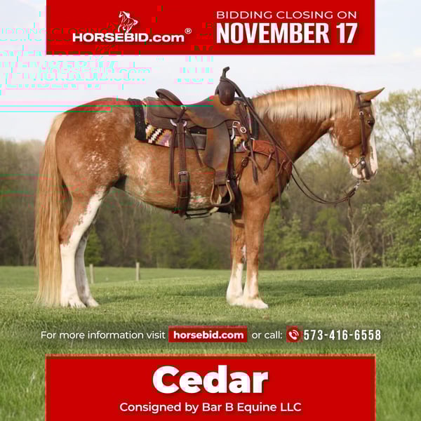 🎲𝓽𝓱𝓮 𝐑𝐈𝐃𝐄𝐑'𝐒 𝓒𝓱𝓸𝓲𝓬𝓮🎲 Happening now thru MONDAY | NOVEMBER 17th - Available EXCLUSIVELY on HorseBid's website! For more details and to register visit: www.Horsebid.com CONSIGNOR CONTACT: Bar B Equine LLC 573-416-6558 LOCATION: Owensville Mo BREED: QH X REGISTERED: No REGISTERED NAME: Cedar COLOR: Red roan sabino HEIGHT: 14.3 AGE: 12 GENDER: Mare Introducing Cedar, the horse one could only dream of having for themselves! This stunning red roan sabino 12 year old mare stands at 14.3 hands tall and is a finished 3D barrel horse, ready to take you to the winner's circle at local shows and barrel races. Cedar is easy going with impeccable ground and saddle manners. She self-loads, backs off the trailer effortlessly, and hauls like a dream, whether it's solo or in a group. Fun to ride and equipped with a handy neck rein and leg pressure, Cedar excels on trails, confidently crossing obstacles and embracing the great outdoors. There has never been a time I’ve dreaded being around or on this mare, everything is always such a breeze and completely hassle free. With her sweet personality and desire for attention, catching her is never a chore! Cedar is sound, requires no maintenance (even barefoot), and thrives on a simple forage diet. Plus, she stands up beautifully in any arena no matter how dry or sloppy and has no known health issues, aside from a minor scar that doesn’t bother her a lick. No need for spurs here—she's all about cooperation! Cedar rides in all sorts of variety, being a halter, bridal, war bridal or just a neck rope- this gal will do it all bareback or saddled! Cedar has been lightly jumped over small fences and fallen trees on the trails, and she has also done some ranch/trail classes through our local saddle club! Cedar is classy, safe, and honest- and has limitless opportunities. With her eye catching color and charming chrome, you’re BOUND to turn heads everywhere! This is a mare I seriously trust to carry me through war- she is determined, and full of try yet never overdoes herself. She is an absolute dream that I am so grateful I’ve been able to enjoy! Cedar is not barn, trailer, buddy, gate, anything sour- she will walk right in and out of that arena like she’s carrying a baby. She is extremely user friendly and will work off of neck rein, leg pressure, or a light plow rein- making her incredibly enjoyable for all level riders! Wether you’re looking for a partner to enjoy the trails with, a horse the whole family can enjoy, something to show you the ropes of the show world, or a step up barrel horse for you or your kiddos- Cedar has you covered in more than just one aspect! I really can’t say enough good things about this mare, and could ramble on and on about her for days on end (just call and I will prove that)- but I’ll just end by saying that this mare has done us wonders, she makes every horse task less chore-like, and she gives the joy in the simple things. She really makes you grateful for good horses, and we’ve been incredibly over the moon grateful for her!