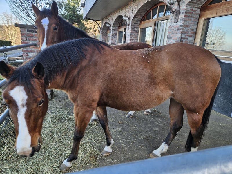 Sue est une monture de confiance absolue, sans défauts. Idéale pour le loisir et les promenades en main. Elle apprécie également le travail à la longe. Elle conviendrait parfaitement aux enfants. Elle est coopérative et souhaite bien faire. N'ayant jamais été réellement formée, elle manque des bases en manège. Le chargement en van devrait également être entraîné. Je ne l'ai jamais fait, car je sortais uniquement en balade. Elle a un tempérament agréable et, même si elle n'est pas régulièrement exercée, elle se comporte parfaitement lors de la prochaine sortie.