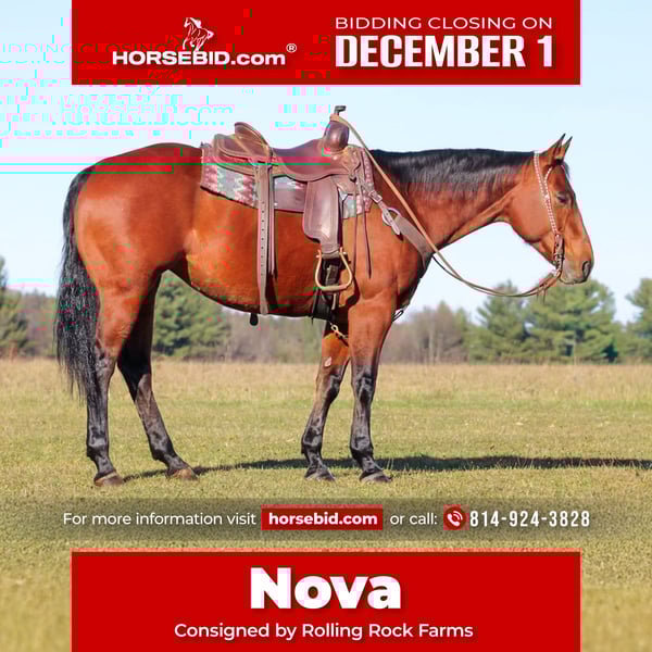 ⚜️ 𝓽𝓱𝓮 𝐇𝐨𝐫𝐬𝐞𝐦𝐚𝐧'𝐬 𝓢𝓱𝓸𝔀𝓬𝓪𝓼𝓮⚜️ Happening now thru MONDAY | DECEMBER 1st - Available EXCLUSIVELY on HorseBid's website! For more details and to register visit: www.Horsebid.com CONSIGNOR CONTACT: Rolling Rock Farms 814-924-3828 LOCATION: Miola, PA BREED: Quarter Horse REGISTERED: No COLOR: Bay HEIGHT: 15.2 AGE: 12 GENDER: Mare Nova is a 12 year old bay mare standing a solid 15.2 hands, with the kind of presence, training, and dependability that make her a standout in any program. She is a very broke, well finished using mare with a great foundation and a level mind. In the arena, Nova is a pleasure to ride. She neck reins with ease, carries herself naturally collected, and pivots correctly and willingly on her hind end. She rides primarily off your seat and body cues, making her feel soft, responsive, and connected. Her trot is smooth and steady with a natural low headset, and she lopes off on a simple one step cue into a comfortable lope. She has a confident, clean stop and stays quiet and patient throughout her work. Nova is also well trained in more advanced maneuvers. She side passes willingly and has been trained to carry the American flag, handling it calmly and without hesitation. She has been extensively ridden outside and has seen a wide variety of terrain, obstacles, and environments. Whether it is hills, water, bridges, open fields, or wooded trails, she navigates everything with confidence. She is used to busy settings and is unfazed by dogs, traffic, vehicles, and farm equipment. Nova is the kind of mare you can take out no matter the conditions and trust to remain level headed and reliable. On the ground, she is equally impressive. Nova shows excellent manners, is easy to handle, and is very respectful of space. She stands tied quietly, saddles and bridles without issue, and enjoys being bathed and groomed. She stands well for the farrier and loads, unloads, and hauls with zero fuss. In a herd setting, she is middle of the pecking order and gets along well with both mares and geldings. Nova would be well suited for a beginner intermediate rider who wants a confident, kind, and forgiving partner with enough training to help them continue progressing. She is broke, dependable, and ridden regularly, making her a great match for someone who values safety, consistency, and responsiveness. Nova is fully maintained and ready to go. She is up to date on all routine care, including a current negative Coggins, recent deworming, a rabies vaccine, and a thorough health and lameness evaluation completed on 11/17/2025. She has been consistently cared for, ridden, and kept in a solid program. Overall, Nova is a dependable, versatile, and exceptionally well broke mare suitable for riders seeking a trustworthy partner with training, reliability, and a willing attitude. She is the kind you can enjoy in the arena, take down the trail, and confidently put to work. If you would like to check out Nova or have any questions please feel free to contact Ethan at (814) 924-3828