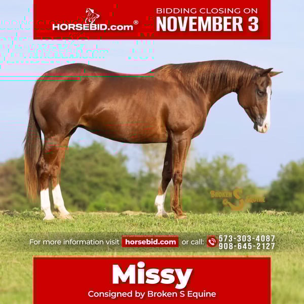 ⚜️𝐓𝐇𝐄 𝐅𝐀𝐋𝐋 𝐇𝐄𝐑𝐈𝐓𝐀𝐆𝐄 𝐂𝐋𝐀𝐒𝐒𝐈𝐂⚜️ Happening now thru MONDAY | NOVEMBER 3rd - Available EXCLUSIVELY on HorseBid's website! For more details and to register visit: www.Horsebid.com CONSIGNOR CONTACT: Broken S Equine Beau 573-303-4087 or Kieran 908-645-2127 LOCATION: Bogard, MO BREED: Quarter Horse REGISTERED: Yes REGISTERED NAME: Miss Light Trash ** 𝘉𝘺 𝘛𝘳𝘢𝘴𝘩𝘢𝘥𝘦𝘰𝘶𝘴** COLOR: Sorrel HEIGHT: 14.3 AGE: 13 GENDER: Mare Miss Light Trash "Missy" is a 13 year old AQHA mare standing a stout and sturdy, perfectly put together, 14.3 hands high. She is an own daughter of Trashadeous. Missy is the definition of safe, and is a finished reining horse through and through. She has taught countless youngsters (and adults) the ropes, trail rides, goes English, and has been a fantastic broodmare too! Whether your goal is to learn, gain confidence, win in the show pen, or have a qualified and proven broodmare to take your program to the next level - Missy will not disappoint. Under saddle, Missy is elegant, stylish, and confident. She performs all the reining maneuvers with ease, and is happy top make up for rider error when needed. She knows her job and does not need a constant professional program to stay sharp. She has effortless spins, big stops, and flying changes. She lopes easy circles and is more than happy to walk and jog around with the kids all day long! If you want a seasoned pro to teach you the ropes, Missy is your girl. You can take her anywhere and she comes off the trailer a true professional anywhere she goes. On the trails, Missy is happy to relax and go along wherever you point her. She crosses water, is safe in traffic, and will ride alone or in a group. She does not get worked up by her surroundings, and is just as happy riding out across the pasture as she is in the show pen. In the barn, Missy is sweet and gentle. She is happy living in her stall or out in the pasture. She is an easy mare to have around, and is no drama. She is polite and sensible around studs, other mares, and colts. She loves her people, and enjoys getting attention. ⚫️Missy is an easy keeper with no quirks. We have a recent, clean vet check on file. ⚫️Our program aims to train and produce top quality horses and ponies for all disciplines and experience levels. Check out our website for testimonials! ⚫️We are located in Bogard, MO. We can help you arrange shipping anywhere! ⚫️For more information about Missy, or any of our other horses call or text us. Kieran 908-645-2127 Beau 573-303-4087