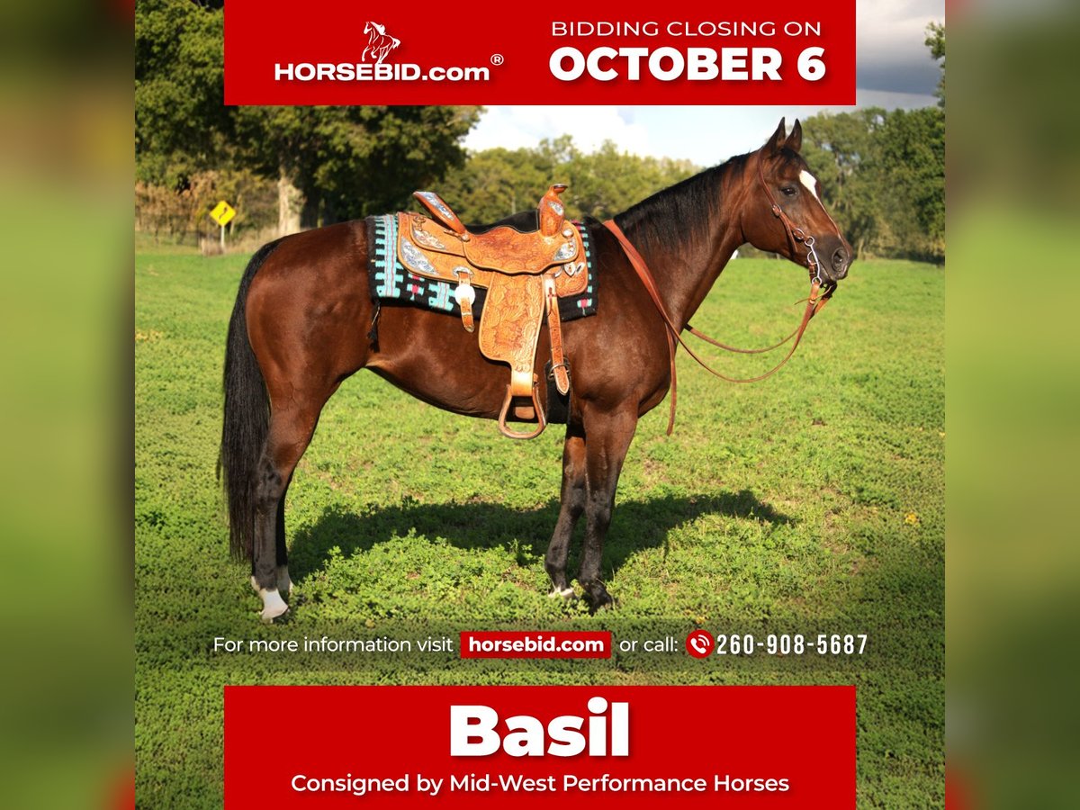 🍂 𝓐𝓾𝓽𝓾𝓶𝓷 𝑨𝑳𝑳 𝑺𝑻𝑨𝑹 𝑳𝑰𝑵𝑬𝑼𝑷 🍂 Happening now thru MONDAY | OCTOBER 6th - Available EXCLUSIVELY on HorseBid's website! For more details and to register visit: www.Horsebid.com CONSIGNOR CONTACT: Mid-West Performance Horses 260-908-5687 LOCATION: Saint Joe, IN BREED: Quarter Horse REGISTERED: No COLOR: Bay HEIGHT: 14.3 AGE: 13 GENDER: Mare Meet the one and only, "Basil"! Basil is a 14.3 hand, Quarter Horse mare, standing a stout and firm 1,200 pounds, with lots of muscle. She checks all the boxes for anyone wanting a good, steady, consistent ranch horse. Basil loves attention, and is always looking for her next friend! She is consistant eveytime you take her out. Whether your going for a trail ride, team penning event, cow sorting in the field, or even take her to a reining event, shes always the same! Basil has been riddin by my 15 year old daughter on trail rides, and she is always the same ole, same ole! She has absolutely no buck, rear, kick, or bite. She does not require any maintenance or shoes. Basil has clean legs and is ready to go! Basil spins very easily with leg pressure. She has a nice slow collected trot and lope, or you can open her up as well and she'll kill it, everytime. She is 100% neck reined and leg pressure trailed. She does phonomal roll backs and will really get underneath herself. She is not spooky and takes to new places perfectly. She has a "stop dead in her tracks" stop. She backs very easily, and is very light mouthed. She is very controllable in any situation you put her in. She jumps right in the trailer, and you never know she's back there while hauling. She does great for the ferrier and to be bathed. Basil is suitable for any age of person from youth rider to adult. She would make a great junior rodeo horse or make any adult a fantastic all around, handy ranch or trail horse! Come check her out! Contact April with any questions. We can arrange shipping anywhere within the USA. Please contact me for more information!