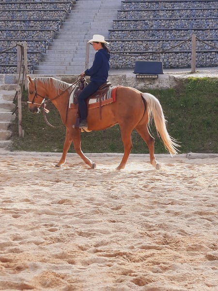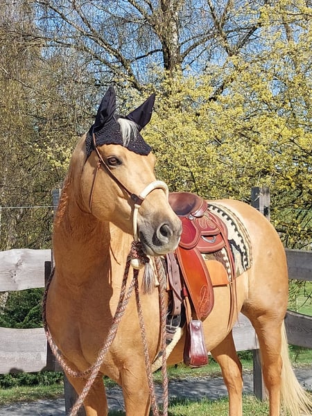 I am offering my 13-year-old, beautiful Quarter Horse mare GK Miss Shade Olena for sale. "Peaches" is a lively, talented sport horse with a strong "will to please." She enjoys being worked and brings great joy to her rider. I would describe her as an intelligent, movement-loving, and also affectionate horse. Currently, she is kept in an open stable during the day and in a box at night. She has never been ill or lame and has had a correct foal (which is also at my farm). I could see her as a broodmare as well, but I do not want to sell her solely as a breeding mare. A suitable home would be one where she can maintain her social contacts, such as an open stable, and where an experienced rider can further develop her strengths and overlook her weaknesses with a smile. She would also be well-suited for riders with ambitions for EWU competitions. I can very well imagine her excelling in trail and ranch classes. She is not a beginner horse! Too much pressure or unfairness from the rider can cause her to become insecure. Apart from her foal pause, she is regularly ridden, so with a bit more targeted training, she would be "ready to show" soon. If interested, please contact me at 0175-1175379 (also via WhatsApp).