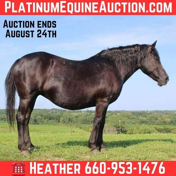ONLINE AUCTION Place your bids at www.PlatinumEquineAuction.com Starting Bid $3500 Auction ends August 24th, 2025 Need a new saddle? Check out White Rock Saddles on our website or Facebook ONE-OF-A-KIND DRAFT PONY CROSS – SAFE, STOUT & SWEET! Meet Fiona! This 14-year-old, coal black draft pony cross mare is truly a rare find. Standing 14.1 hands and built like a tank, Fiona is the kind of horse that turns heads wherever she goes. She’s an easy keeper, sound, and suitable for the whole family—from kids and beginners to adults needing a steady confidence builder. Fiona is a saint on the trails, in town, or even at the Sonic Drive-In! She handles highway traffic, parades, and commotion like a pro. Ride her out alone or with a group—she’s the same quiet, gentle girl every time. She’s also broke to drive, has great feet, and responds well to voice commands with a smooth walk, trot, lope, and solid “whoa.” Fiona has been preg-checked open, she sells safe and sound, the vet paperwork is available to any interested party. Located in Princeton, Missouri.📞 Contact Heather Stark 660-953-1476 for more info or to schedule a visit. Draft ponies are a rare find and Fiona is even more rare being coal black with great mind Don’t miss your chance at this special mare—Fiona is the total package! ONLINE AUCTION Place your bids at www.PlatinumEquineAuction.com Starting Bid $3500 Auction ends August 24th, 2025 Need a new saddle? Check out White Rock Saddles on our website or Facebook