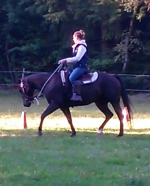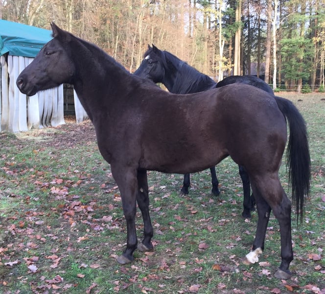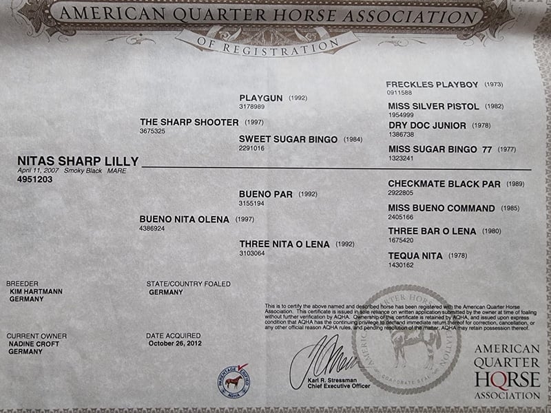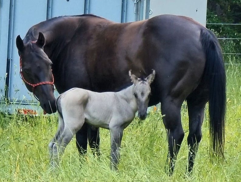 Lilly ist eine bildschöne, gesunde und unverbrauchte Smoky Black Quarterhorse Stute im bestem Alter, mit feinem Pedigree und absolut ehrlichem Charakter. Sie schenkte mir vor knapp 3 Jahren ihr erstes „Kracher-Fohlen“ (von „IJ Rocky Steeldust“) in der Sonderfarbe „Smoky Grullo“ und sie ist aufgrund ihrer Top-Form definitiv auch weiterhin noch voll zuchttauglich. In der richtigen Anpaarung beglückt sie Dich mit exklusiven „Sonderlack-Fohlen“. ( a/a E/E , 5 Panel negativ) Darüber hinaus ist Lilly mega brav und unkompliziert im Umgang, dem Menschen gegenüber stets respektvoll und sie war, selbst als sie ihr Fohlen bei Fuß hatte, niemals zickig zu uns, sondern immer allen liebevoll zugewandt und eine rührende Mutter. Ich persönlich würde sie gerne nochmal als Zuchtstute sehen wollen. :-) Auch ihr Fohlen („Sharp Steels Dust“) ist tadellos im Charakter, völlig cool und ein echter Traumprinz geworden. Er steht ebenfalls „Ready to start“ zum Verkauf (siehe weitere Anzeige). Lilly ist foundation gezogen. Ihre Mutter „Bueno Nita Olena“ von Kim Hartmann war erfolgreich im Reiningsport plaziert, ihr Vater „The Sharp Shooter“ von Enja Libour ebenso im Cutting. Sie hat eine Westerngrundausbildung und wurde nach Natural Horsemanship Prinzipien weiter ausgebildet. Sie geht brav im Gelände (natürlich auch ganz alleine), ist ein toller Allrounder, gelassen im Trail, springt schön, schwimmt und plantscht gerne, ist routiniert in der Bodenarbeit sowie im Liberty und ist mir viele Jahre eine tolle, verlässliche Freizeit-Partnerin gewesen. Sie lässt sich auch nur mit Halsring reiten. Bis letztes Jahr habe ich mit ihr etwas Reitunterricht bei Alexander Eck genommen und auch den einen oder anderen Trailkurs besucht, bis zu ihrem Verkauf werden wir auch weiterhin am Unterricht bei Alexander teilnehmen. Natürlich ist Lilly Schmiede- und Verladefromm, sie ist Bar-Hufer mit Top Hufen und brauchte nie Eisen. Bei uns lebt sie frei mit 3 Wallachen auf 2HA Weide am Haus mit unmittelbarem Familienanschluss. Ich wünsche mir für sie ein zu Hause, wo sie genauso als Familienmitglied zählen darf wie hier bei uns. Ich verkaufe sie nur sehr schweren Herzens wegen Aufgabe der Pferdehaltung und des Reitsports. Sie verdient einen Menschen der sie nicht nur reitet oder mit ihr züchtet sondern sie auch liebt und schätzt. Ihr Zubehör kann auf Wunsch gegen Aufpreis erworben werden.
