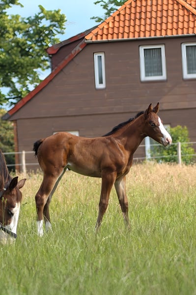 God Loves Chocolate - diese elegante Quarter Horse Stute, 6.2025 geboren mit einem geschätzten Endmaß von 150 cm, ist ein wahrer Hingucker mit viel Ausdruck und Präsenz. Sie besitzt ein korrektes, gutes Gebäude, ist gut bemuskelt und äußerst athletisch. Gesund und vital ist sie bei Abgabe altersgemäß geimpft und entwurmt. Schoki wächst in einer kleinen Stuten- und Fohlengruppe auf, wird in Offenstall- und Wiesenhaltung gehalten und ist gut sozialisiert. Sie ist sehr menschenbezogen, neugierig, verschmust, freundlich, offen und interessiert. Leicht im Handling, gelassen, lernwillig und bewegt sich geschmeidig. Besonders beeindruckend ist ihr schöner Raumgriff und ihr toller Untertritt. Damit kann sie auch gut eine Pleasure mit gehen. Schocki wird ein echter EWU Allrounder. Hancock meets Cowhorse - ein gelungener Outcross, der wirklich überzeugt. Wird mit AQHA-Papieren abgegeben, und eine klinische AKU wird im Rahmen des Verkaufs von der Züchterin in Auftrag gegeben. Ob für Sport, Turnier oder Freizeit - dieses Fohlen ist vielseitig einsetzbar und wird auch den Freizeitreiter mit gehobenen Ansprüchen glücklich machen.