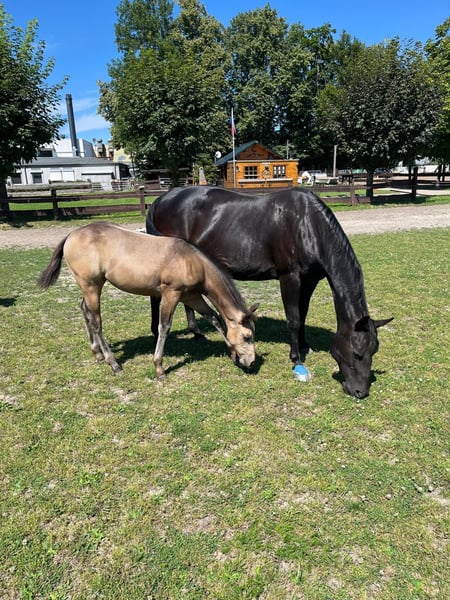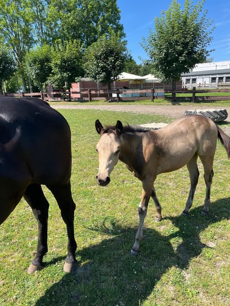 Bärbel – 1-jährige Quarter Horse Stute in Dark Buckskin mit Top-Abstammung. Ein echter Hingucker mit Charme, Ausstrahlung und Qualität! Unsere Bärbel ist eine bildschöne, dunkel buckskinfarbene Jungstute mit dem gewissen Etwas. Schon jetzt zeigt sie, was in ihr steckt – eine Traummaus mit Ausdruck, harmonischem Körperbau und klarem, freundlichen Charakter. ✅ Alter: 1 Jahr ✅ Farbe: Dark Buckskin ✅ Rasse: Quarter Horse ✅ Abstammung: Vater: SR Hollywood Dundee (Hollywood Dun It-Linie) Mutter: SR Reminics Melinda (Reminic gezogen) Mit ihrer exzellenten Abstammung vereint Bärbel bewährte Reining-Genetik – Hollywood Dun It trifft auf Reminic – und bringt damit alles mit, was man sich für Sport, Show oder Zucht wünscht. Sie wächst artgerecht auf, ist halfterführig, neugierig und menschenbezogen. Egal ob du einen zukünftigen Sportpartner, ein Zuchtjuwel oder einfach ein Pferd mit Ausstrahlung suchst – Bärbel zieht alle Blicke auf sich! Bei Interesse und für weitere Informationen freuen wir uns auf Ihre Kontaktaufnahme.