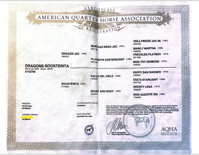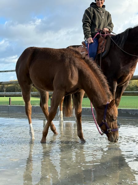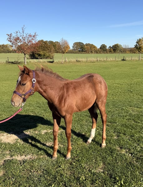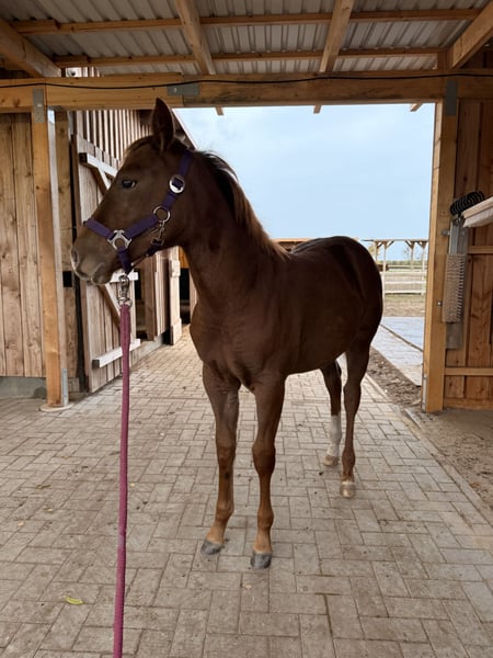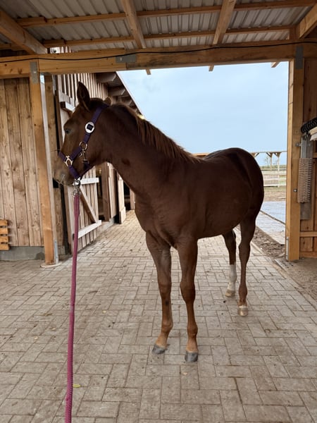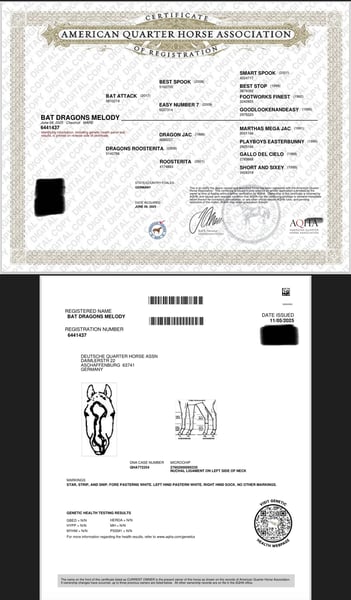 🩶 Bat Dragon’s Melody – a beautiful Quarter Horse filly looking for her forever home 🩶 Born on June 8th, 2025 Our little Melody is a true sweetheart – stunning, sensitive, and incredibly eager to learn. She captivates with her loving nature and her attentive gaze, which reveals how intelligent and refined she is. ⸻ 🐴 Character & Training Melody is very people-oriented and affectionate. She loves her familiar humans and shows daily how much trust and affection she has to offer. Initially, she may be a bit reserved around new people or unfamiliar situations – she observes carefully first. But with a little time, she warms up and shows what she’s made of: calmness, curiosity, and a lot of heart. 💞 She reliably applies what she has learned – she quickly memorizes routines and wants to please her handler. She knows the complete foal’s ABC: she is well-behaved for grooming, leading, and tying, easily loads onto a trailer, and is an exemplary horse when it comes to the farrier. Twice a week, a trainer works with her (including desensitization training and relaxation exercises). ⸻ 🏡 Raising & Housing Melody is raised with family contact right at the farm and lives in a mixed open stable group. Currently, she is still walking beside her mother but can be gently and stress-free weaned in consultation with the new owner. We have plenty of space and large, well-maintained paddocks where she can move freely and develop healthily. ⸻ 📜 Papers & Health - AQHA registration papers & DQHA equine passport - Parent genetic testing: 6-panel N/N ⸻ 📍 Location: 23923 Schönberg (Mecklenburg) 💰 Price: €12,000 In the last photos, her mother and father (including papers) are visible. If you have any questions or are interested, please feel free to contact us at any time – we look forward to meeting Melody’s new heart humans who will give her the time she needs to build trust. 🤍