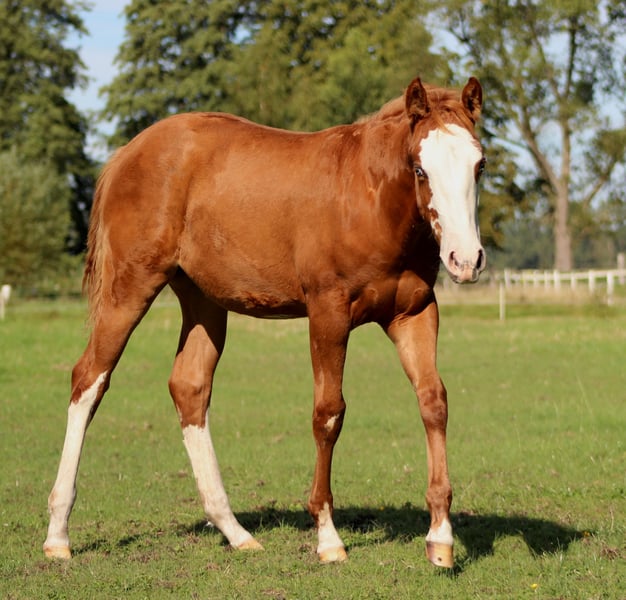 Custom Chrome Line | Modern | Athletic | Performance-Ready We are offering an expressive American Quarter Horse mare, born in 2025, featuring a striking, eye-catching blaze and a large-frame, modern build characteristic of the Custom Chrome lineage. This mare combines size, substance, and athletic elegance – exactly the type in demand in today’s reining sport. She already demonstrates natural talent for reining: good balance, body control, and a pleasant self-carriage. Notably, she shows a high willingness to learn and a calm, people-oriented nature – ideal prerequisites for future training in the sport. Breeding & Papers The mare has been raised in a professional, horse-friendly environment and is well-handled for her age. She possesses: - AQHA Certificate of Registration (COR) - DQHA Equine Passport She has been regularly dewormed and is familiar with the farrier, laying a solid foundation for her further development. Prospect A high-quality reining prospect for ambitious non-pro or open riders, as well as for breeders seeking a large-frame, modern type with performance potential and charisma. ✨ Further upbringing at our facility is possible 📍 Location: Stade, Germany 🌐 www.white-diamond-horses.de