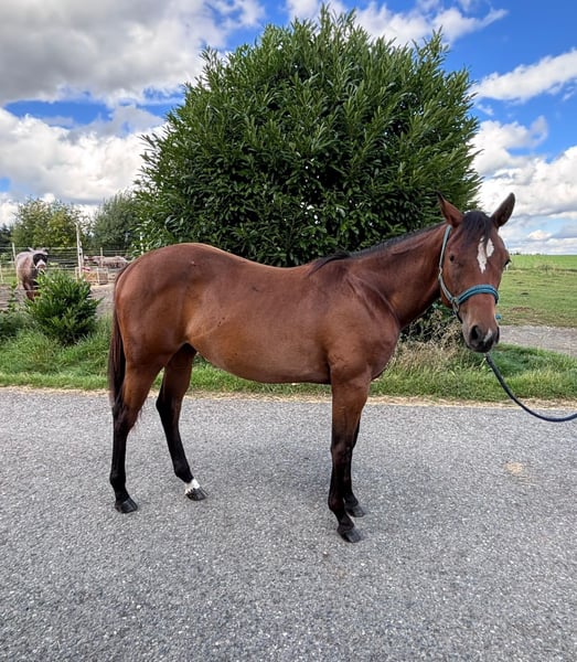 My Blue Charm - die am 01.03.2024 geborene Quarter Horse Stute ist ein echtes Nachwuchstalent mit bester Allround- und Pleasure-Abstammung. Sie ist aktuell ca. 145 cm groß und wird voraussichtlich ein Endmaß von etwa 155-160 cm erreichen. Mit ihrer ausdrucksstarken braunen Farbe, dem harmonischen Gebäude, der ausgewogenen Bemuskelung und ihren korrekten Beinen mit gesunden, starken Hufen überzeugt sie schon jetzt auf ganzer Linie. Rose ist gesund, gut entwickelt und wurde artgerecht im Herdenverband aufgezogen. Sie kennt sowohl die Box mit täglichem Weidegang als auch das Leben auf dem Paddock und zeigt sich in der Herde absolut sozial und umgänglich. Im täglichen Umgang präsentiert sie sich aufmerksam, freundlich und sehr menschenbezogen. Rose ist aufgeschlossen, neugierig, unkompliziert und lernt schnell. Ihr ruhiges, angenehmes Wesen in Kombination mit einem wachen Geist macht die Arbeit mit ihr besonders angenehm. Ob beim Tierarzt oder Hufschmied - sie zeigt sich stets brav und gelassen. Geimpft, entwurmt und gechippt ist sie bestens versorgt und kennt bereits das kleine Fohlen-Einmaleins. Auch an Umweltreize wie Landmaschinen, Hunde und Kinder ist sie gewöhnt. Ihre Bewegungen sind fließend und vielversprechend für den späteren Einsatz im Pleasure- oder Allroundbereich. Futurity startberechtigt!! My Blue Charm bringt alles mit, was man sich von einem jungen Pferd wünscht - eine tolle Basis für Sport, Freizeit oder Zucht.