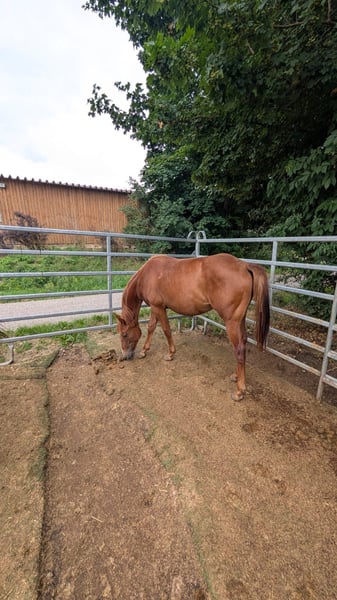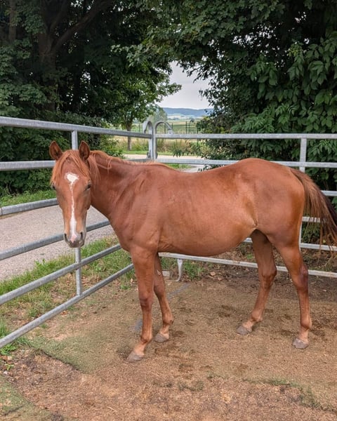Kitty Metallic Cat - eine äußerst vielversprechende Quarter Horse Jährlingsstute, 4.2024 geboren, mit einem geschätzten Endmaß von 150 cm, mit erstklassiger Abstammung - ein echtes Juwel für Show, Freizeit und Zucht! Dieser Youngster überzeugt mit einem korrekten Gebäude, viel Fundament und guter Bemuskelung. Sie wächst artgerecht im Herdenverband auf und kennt sowohl Offenstallhaltung als auch Weidegang. Charakterlich lässt Kitty keine Wünsche offen: Menschenbezogen, freundlich, aufgeweckt, neugierig und verschmust. Es wird regelmäßig gehandelt, kennt das Fohlen-1×1, lässt sich ruhig anbinden und zeigt sich stets kooperativ im täglichen Umgang. Ein echter Hingucker mit tollem Bewegungsablauf - ein Top-Prospect für den Cutting Sport! Kitty bringt alle Voraussetzungen mit, um sich voraussichtlich zu einem erfolgreichen Showpferd oder zuverlässigen Freizeitpartner zu entwickeln - auch als Zuchtpferd sehr interessant. Sie ist eine Enkelin von Metallic Cat und Smooth As A Cat. Ihr Vater ist der erfolgreich geshowte Titanium Toy. Aufgrund einer Bestandsreduzierung wird dieser Schatz schweren Herzens abgegeben.
