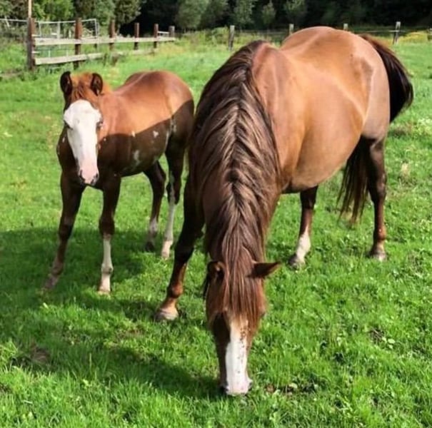 Stute Panels getestet, alles negativ, außerhalb Träger LWO. Sehr menschenbezogene Stute, schöne Statur (Videos über WhatsApp). 2 blaue Augen, keine Mängel. Ende Stockmaß geschätzt auf 1,52 m. Kennt Schmied, Dusche, Verkehr, Transport läuft problemlos auf dem Anhänger. Bereits an der Longe mit Longiergurt. Nimmt alles schnell auf. Farbenpanels sind ebenfalls vorhanden, ordentlich entwurmt. Auch Equipment vorhanden.
