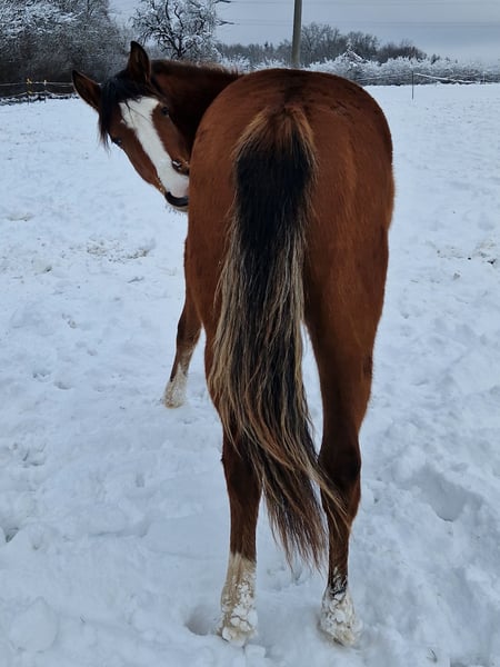 Super schicke 1er Prämien-Stute, auf DQHA Zuchtschau Platz 1, mit korrektem Gebäude, elastischen Gängen, Top-Bewegungen. Top Reining/Allrounder, keine Gendefekte! Kennt Bodenarbeit mit einfachen Trail-Hindernissen und Gelände als Handpferd. Ist brav beim Schmied und lässt sich gut verladen. Mega Pedigree mit besten amerikanischen und italienischen Spitzenvererbern! Doppelt registriert als Quarter- und Painthorse und damit in beiden Verbänden startberechtigt! Wird eher größer vom Stockmaß, ca. 155cm. Weitere Informationen gerne unter: 0177-2002275