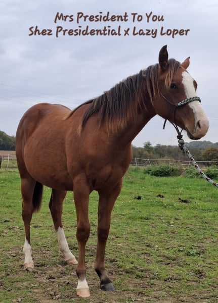 Mrs President To You ist eine bildhübsche Quarter Horse Stute, geboren am 28.06.2024 in der Farbe Bay, mit einem geschätzten Endmaß von ca. 156 cm. Die AQHA-Papiere liegen vor. Sie ist korrekt gebaut, gut entwickelt und ausgewogen bemuskelt, sodass sie später auch größere Reiter gut abdecken wird. Sie zeigt bereits jetzt sehr gute Grundgangarten und bringt damit beste Voraussetzungen für eine sportliche Zukunft mit. Sie stammt direkt von Lazy Loper ab, ihre Mutter, Shez Presidental hat 102 AQHA Punkte. Beide Elternteile wurden erfolgreich im Sport vorgestellt und verfügen über eine erstklassige Pleasure- und Allround-Abstammung. Damit eignet sich die Jungstute sowohl für die Turnierlaufbahn als auch für die Zucht oder als hochwertiger Freizeitpartner mit Perspektive für die Allround-Klassen. Die Stute ist gesund, regelmäßig entwurmt und steht alle vier Wochen beim Hufschmied. Sie besitzt eine sehr gute Hufqualität. Die Stute wächst im Herdenverband auf und kennt das Fohlen-1x1, ist halfterführig und altersgerecht erzogen. Sie ist 4-Panel n/n und GBED n/p. Charakterlich zeigt sie sich sehr lieb, menschenbezogen und neugierig, sie möchte gefallen, lernt schnell und ist im Umgang brav, kann altersbedingt aber auch mal frech werden. Daher wünscht sie sich einen erfahrenen Menschen, der sie weiterhin altersgerecht fordert und fördert. Ob zukünftiges Showpferd oder verlässlicher Freizeitpartner - mit ihrem Potenzial für die Allround-Klassen ist Mrs President To You ein echtes Versprechen für die Zukunft.