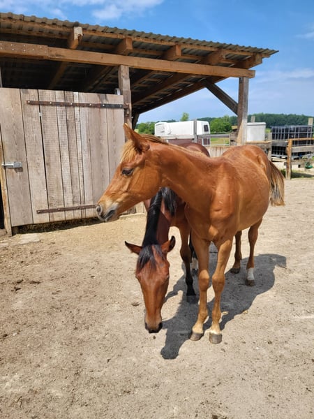 Pour notre « ANNIE » (ZIPPOS BLUE FIRE), nous recherchons également une famille d'accueil 5 étoiles. Cette magnifique jument Quarter Horse, née en 2024, est née chez nous. Ses parents vivent également sur notre ferme : Mère : TL Blue Alice (Aint It The Blues) Père : Zippos King Bar Annie est une véritable beauté, avec un look remarquable : Sa robe est difficile à décrire : un brun/gris foncé avec une légère touche cuivrée au soleil. Elle possède également des yeux très expressifs, d’un gris foncé à bleu, ce qui en fait une véritable attraction visuelle ! Elle a une silhouette harmonieuse et une tête à faire fondre le cœur ! Elle se déplace avec une aisance exceptionnelle et convient aussi bien pour des compétitions que pour la balade. Si vous cherchez quelque chose de vraiment exceptionnel, Annie sera la perle rare. Elle a déjà appris tout ce qu’il faut à son âge : donner les pieds, se faire présenter chez le maréchal-ferrant, être brossée, lavée, promener ou mener en main. Annie possède un passeport européen pour équidés délivré par la DQHA et les papiers américains (certificat d’enregistrement) de l’AQHA. Nous la vermifugeons régulièrement et la présentons chez le maréchal-ferrant. Elle est actuellement encore avec sa mère chez nous, en élevage. Elle peut rester ici pour continuer sa croissance ou partir dans sa nouvelle famille. Si vous souhaitez faire connaissance avec Annie, n’hésitez pas à nous contacter.
