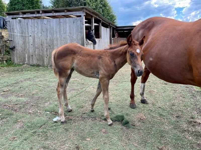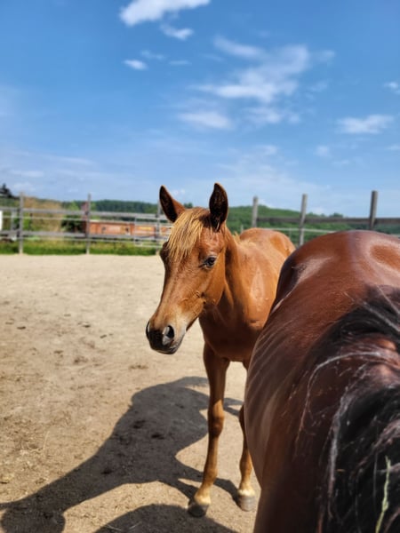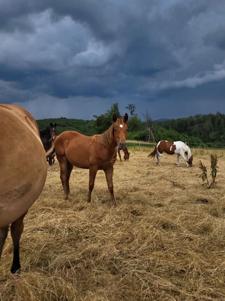 We are also looking for a 5 star home for our "ANNIE" (ZIPPOS BLUE FIRE). The beautiful Quarter Horse mare (born 2024) was born with us. Her parents are also on our farm: Dam: TL Blue Alice (Aint It The Blues) Sire: Zippos King Bar Annie is an absolute feast for the eyes with a striking look: Her coat color is hard to describe: brown/dark gray with a slight copper tint in the sun. She also has very striking dark gray-blue eyes, which make her a real eye-catcher! She has a great build and a head to melt away! She moves exceptionally well and is suitable for both competitions and leisure time. So if you are looking for something really unusual, Annie is a real hit. She has learned everything you need to know at this age: Hoof trimming, presentation to the farrier, grooming, showering/washing, walking/leading. Annie has a DQHA equine passport and the American papers (certificate of registration) from the AQHA. We worm her regularly and take her to the farrier. She is currently still being bred with her mother. She can either stay here for further breeding or move to a new home. If you would like to get to know Annie, just write to us.