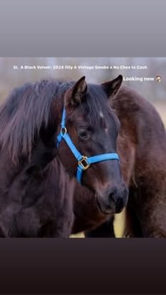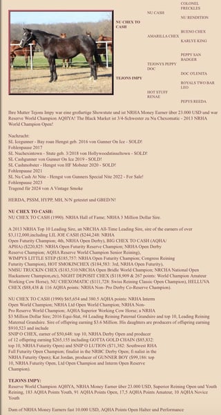 SL Black Velvet ist 6-Panel N/N getestet, NRHA Germany und Eurofuturity nominiert, noch roh - geboren am 8.5.2024 The Black Market: Ihre Mutter Tejons Impy war eine großartige Showstute und ist NRHA Money Earner über 23.000 USD und war Reserve World Champion AQHYA! The Black Market ist 3/4-Schwester zu Nu Chexomatic - 2013 NRHA World Champion Open! HERDA, PSSM, HYPP, MH, N/N getestet und GBED/N! NU CHEX TO CASH: NU CHEX TO CASH (1990). NRHA Hall of Fame; NRHA 3 Million Dollar Sire. A 2013 NRHA Top 10 Leading Sire, an NRCHA All-Time Leading Sire, sire of the earners of over $3,112,000,including LIL JOE CASH ($244,248: NRHA Open Futurity Champion; 4th, NRHA Open Derby), BIG CHEX TO CASH (AQHA/ APHA) ($220,825: NRHA Open Futurity Reserve Champion; NRHA Open Derby Reserve Champion; AQHA Reserve World Champion Senior Reining), WIMPYS LITTLE STEP ($185,757: NRHA Open Futurity Champion; Congress Reining Futurity Champion), HOT SMOKINCHEX ($184,583: 3rd, NRHA Open Futurity), NMSU TRUCKIN CHEX ($183,510:NRCHA Open Bridle World Champion; NRCHA National Open Hackamore Champion,etc), NIGHT DEPOSIT CHEX ($118,909 & 267 points: World Champion Amateur Working Cow Horse), NU CHEXOMATIC ($111,728: Swiss Reining Classic Open Champion), HELLUVA CHEX ($88,438 & 116 AQHA points: NRHA Non- Pro Derby Co-Reserve Champion). NU CHEX TO CASH (1990) $65,654 and 380.5 AQHA points: NRHA Interm Open World Champion; NRHA Ltd Open World Champion; NRHA Non- Pro Reserve World Champion; AQHA Superior Working Cow Horse; a NRHA $3 Million Dollar Sire; 2016 Equi-Stat, #4 Leading Reining Paternal Grandsire and top 10, Leading Reining Maternal Grandsire. Sire of offspring earning $3.6 Million. His daughters are producers of offspring earning $910,523 and include SNIP O CHEX, earner of $50,648: top 10, NRHA Derby Open and producer of 12 offspring earning $265,155 including GOTTA GOLD CHAIN ($85,832: top 10, NRHA Futurity Open) and SNIP O LUTION ($71,382: Southwest RHA Fall Futurity Open Champion; finalist in the NRBC Derby Open; fi nalist in the NRHA Futurity Open); Kat Jordan, producer of GUNNER BOY ($99,186: top 10, NRHA Futurity Open, Ltd Open Champion and Interm Open Reserve Champion). TEJONS IMPY: Reserve World Champion AQHYA, NRHA Money Earner über 23.000 USD, Superior Reining Open und Youth Reining, 183 AQHA Points Youth, 91 AQHA Points Open, 17,5 AQHA Points Amateur, 10 AQHA Novice Youth Dam of NRHA Money Earners fast 10.000 USD, AQHA Points Open Halter und Performance Vater ist A Vintage Smoke - Top upcoming US-Vererber!
