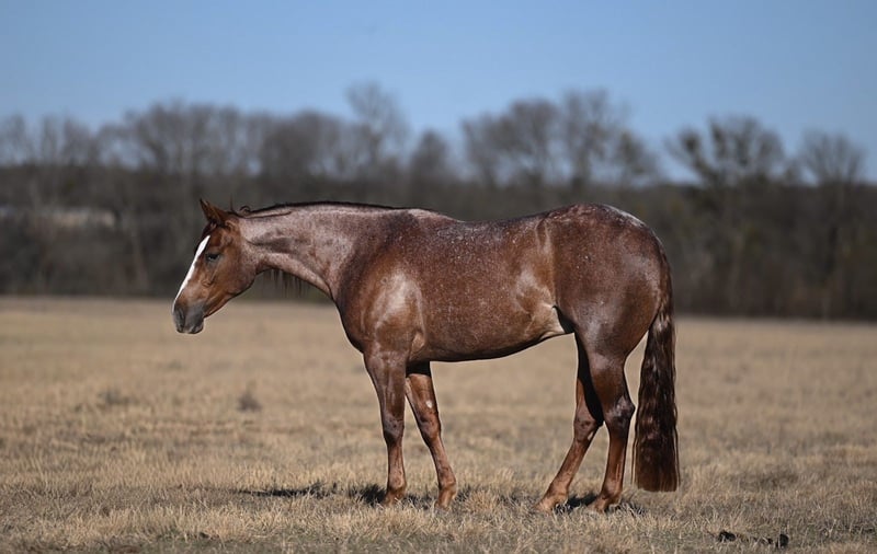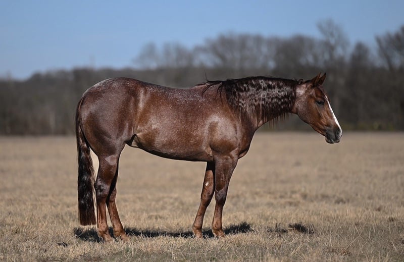 Margo, yegua AQHA de 3 años, de 14.1 manos, color roan rojo