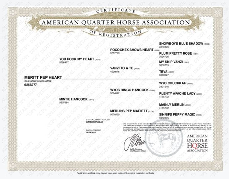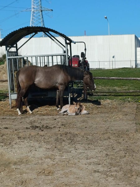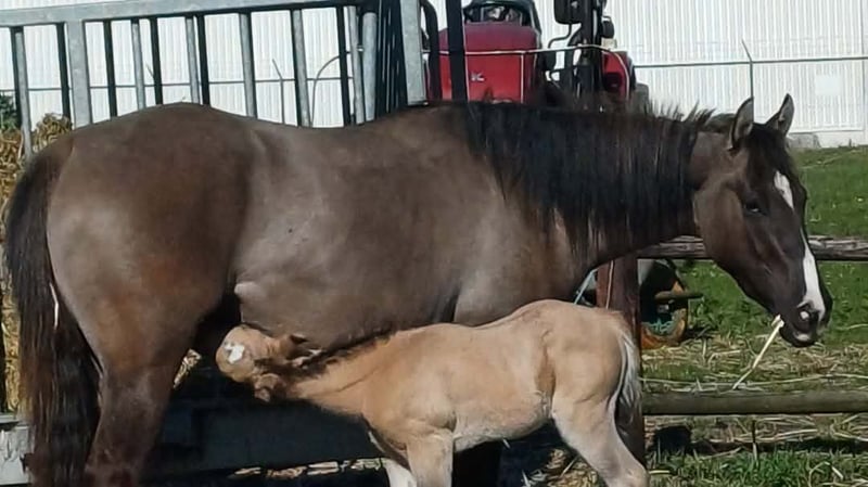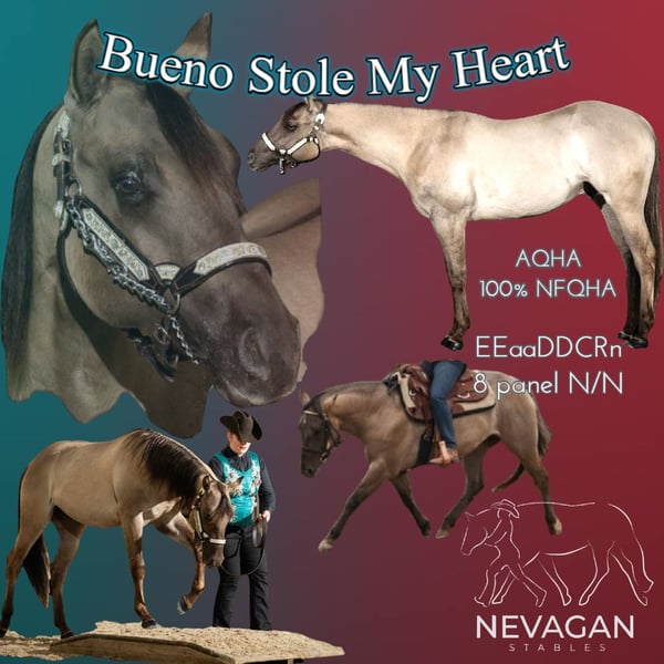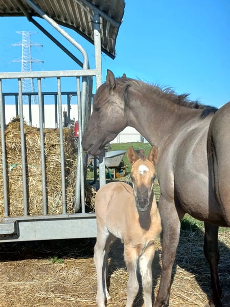 Here is the translation of the horse listing from Dutch to English: --- We are pleased to offer our mare with foal for sale. Name: Meritt Pep Heart Height: 147 cm Born: April 24, 2023 Documents: European conform passport, AQHA papers, and FQHA 90% Tested negative on 7 panels via EtalonDX Color: Grullo and EEaaDnd1 W20n The foal is a colt, either Grullo or Smokey Grullo, pending testing. EEaaD? and possibly cream. He is also tested negative on 7 panels via his parents. 95% FQHA AQHA registration and BQHA passport will be arranged prior to sale. Some additional information about the mare: She is a very affectionate mare, ranking lower in the herd hierarchy. She is shoed every 6-8 weeks. She is dewormed based on manure analysis. She has been on a trailer multiple times and travels easily. She is accustomed to standing tied and is easy to groom. Reason for sale: We are a small-scale breeding operation and have decided to keep fewer mares. Despite being very sweet, she has never formed a strong bond with us. We also decided to keep a foal from this year. Price is inclusive of VAT. Inspection is permitted at the buyer’s expense. These costs are non-refundable. ---