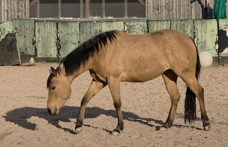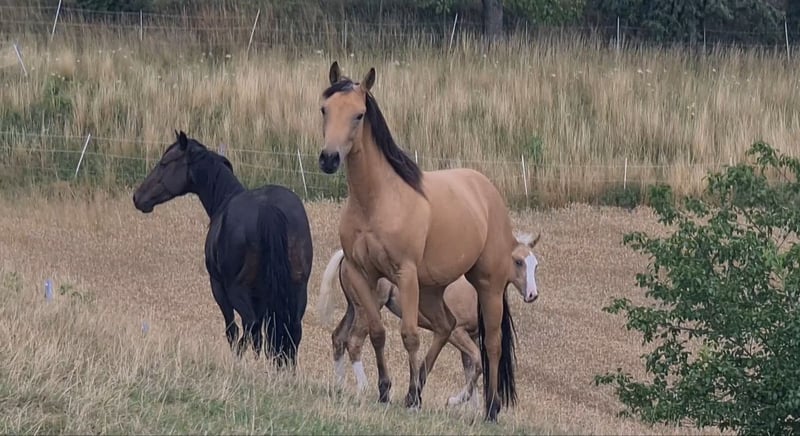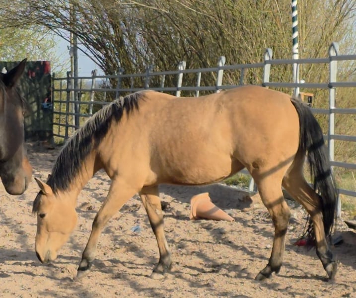 Tamika (HES Sparkling Pearl) Magnifique pouliche quarter mare de 3 ans, de couleur buckskin correcte Née le 18 mai 2023 Issue de notre Dry Little Rocket par ACE Mistr Tinseltown Un mariage absolument réussi, que nous avons répété cette année pour la troisième fois ; la jumelle pleine est attendue pour fin mai. Une jeune jument très typée et également pleine de tempérament. Depuis sa naissance, elle ne cesse de nous faire sourire. Et oui, c’est une jument, une personnalité. Elle est très attachée à l’humain. Elle est encore brute et n’a pas encore été travaillée. Elle accompagne nos juments de reproduction et nos foals, et elle est toujours une excellente partenaire de jeu pour les poulains, très sociable avec les autres chevaux. Elle a une tête particulière, et sait exactement ce qu’elle veut et ce qu’elle ne veut pas. Son prix est actuellement sur demande, car nous envisageons peut-être de la préparer à la monte. Ce travail influencera bien sûr le prix. Pour l’instant, elle est brute, et à part la marche en main sur notre propriété et le parage des sabots, elle n’a reçu aucune autre formation. Elle sera vendue bien sûr avec son passeport, le certificat de conformité (COR) et le rapport de transfert nécessaire. Nous serions ravis de recevoir vos demandes et également votre visite pour faire la connaissance de Tamika.