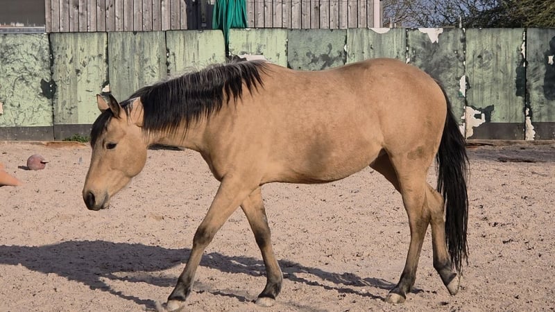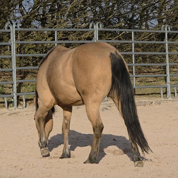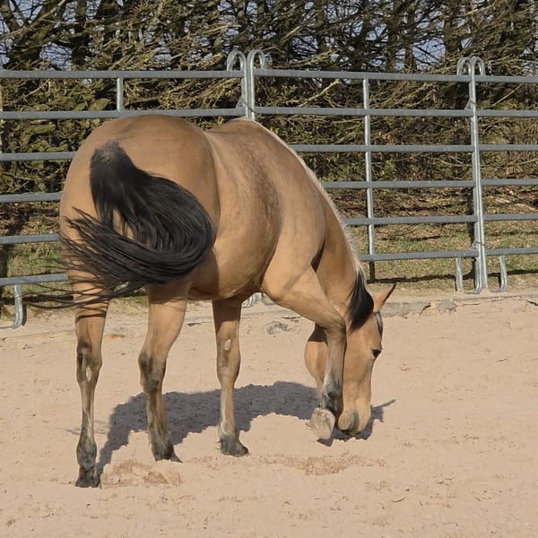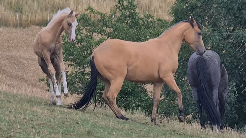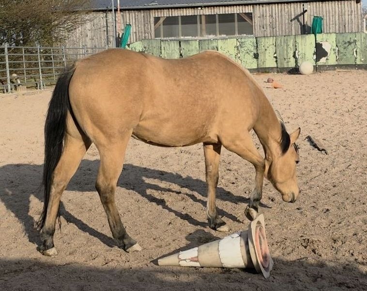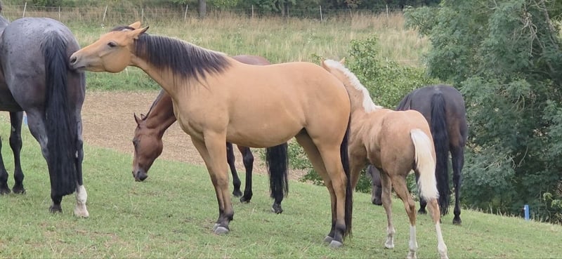 Tamika (HES Sparkling Pearl) Wunderschöne korrekte Buckskin Farbene 3j Quarterstute Geboren am 18.05.2023 Aus unserer Dry Little Rocket von ACE Mistr Tinseltown Eine absolut gelungene Verpaarung, die wir dieses Jahr zum 3ten Mal wiederholt haben das Vollgeschwisterchen wird Ende Mai erwartet. Eine sehr Typvolle und auch Temperamentvolle junge Stute. Die seit ihrer Geburt bei uns immer nur ein Lächeln auf das Gesicht zaubert. Und ja sie ist eine Stute und eine Persönlichkeit. Sie ist dem Menschen sehr zugetan Sie ist noch roh und wurde noch nicht gearbeitet. Sie läuft bei uns mit den Zuchtstuten und Fohlen mit und ist auch in der Gruppe immer ein toller Spielpartner für die Fohlen und sehr sozial im Umgang mit den anderen Pferden. Sie hat einen speziellen Kopf, und weiß genau was sie will und was nicht. Preislich haben wir derzeit diesen auf Anfrage gesetzt das wir sie eventuell noch am Boden vorbereiten. Diese Arbeit wird sich natürlich auch auf den Preis auswirken. Derzeit ist sie Roh und hab bis auf Führen von A nach B auf unserem Hof und Hufbearbeitung noch keine weitere Ausbildung erhalten. Verkauft wird sie natürlich mit Equidenpass und COR sowie den notwendigen Transferreport. Wir freuen uns auf Anfragen und auch über Besuch um Tamika kennenzulernen