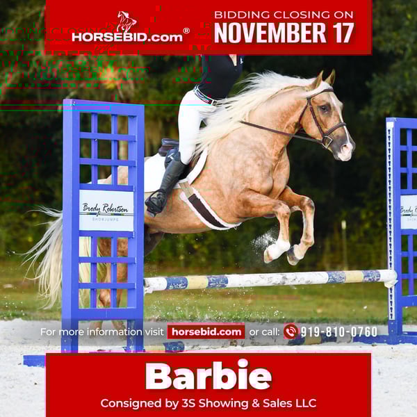 🎲𝓽𝓱𝓮 𝐑𝐈𝐃𝐄𝐑'𝐒 𝓒𝓱𝓸𝓲𝓬𝓮🎲 Happening now thru MONDAY | NOVEMBER 17th - Available EXCLUSIVELY on HorseBid's website! For more details and to register visit: www.Horsebid.com CONSIGNOR CONTACT: 3S Showing & Sales LLC 919-810-0760 LOCATION: Ocala FL BREED: AQHA REGISTERED: Yes REGISTERED NAME: PEPPYS FOOLISHDANDEE COLOR: Palomino HEIGHT: 16 AGE: 3 GENDER: Mare Meet Barbie Coming 4 year old AQHA registered mare. Barbie is a stunning palomino with a dappled golden coat and big, kind eye that turns heads everywhere she goes. She’s eligible for Palomino papers if you’d like to double register her! You can go show in the Open Shows, USEF shows, AQHA, and Palomino. Barbie has done everything (and more!) that a young horse should. She’s started a lovely turn on the haunches, moves off the leg beautifully, and handles obstacle courses with ease. She’s gone cross-country over logs, ditches, and banks, and walks right into the water without hesitation. She’s confident down busy roads in traffic and has been shown successfully with a 10-year-old rider. ✨ Undefeated in Hunter Hack, Barbie has won every single WTC Hunter Hack class she’s entered — even with a 10-year-old rider! She’s been shown indoors, outdoors, and rides in our large open fields, taking it all in stride. She’s been exposed to just about everything: loud bullwhips, tarps, cows, bridges, deer, dogs, and big trucks. 🏆 Show Ring Experience: English Pleasure, Pattern Classes, and Hunter Hack. We also think she’d make a super fun Ranch Riding or All-Around prospect thanks to her laid-back, willing attitude. Her fancy, fluid movement will absolutely turn heads in the Hunter Ring. What I love most about Barbie, coming from the show world, is that she will happily frame up in the bridle or drop the reins and go “long and low.” Barbie is more “whoa” than “go,” but she’s never lazy — she has a perfect natural rate and a great brain. She loads, ties, cross-ties, and stands quietly at the trailer with no fuss. Barbie is an easy keeper. She’s barefoot, sound, and requires zero maintenance. This gorgeous young mare truly checks every box: looks, movement, mind, and heart. We’ve loved having her in our program, and it’ll be bittersweet to see her go. Barbie has been exposed to so many different experiences and is ready for someone to finish her out in their chosen discipline and keep her winning streak going! So come feel like a Barbie girl and live in Barbie’s world! UTD on Coggins, Wormer, Vaccines, Teeth, and Farrier.