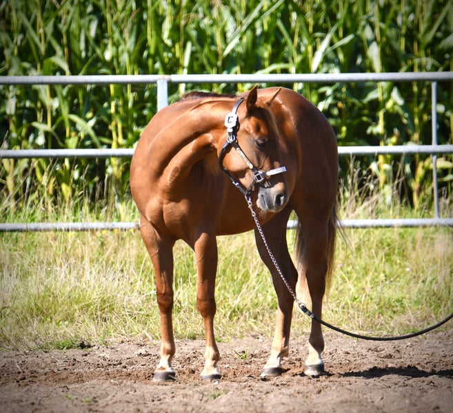2023 QH Stute von Walla Whiz Crome (LTE $ 67.000+, PE $ 270.000,-) aus der Hot Ice Surprise (PE ~ $ 35.000,- LTE $ 2.700,-). Psycho Whiz Crome ist das dritte Fohlen aus der Stute Hot Ice Surprise. Beide Halbgeschwister Tinsels Icecube und Psychokiller laufen erfolgreich im internationalen Open Sport und konnten bisher eine Gewinnsumme von ca $ 35.000,- erreichen. Vater ist der zur Zeit dominierende europäische Vererber Walla Whiz Crome. Er hat mittlerweile offspring earnings von $ 270.000,- . Die Stute wurde im April 2025 unterm Sattel gestartet und zeigt sich sehr talentiert.