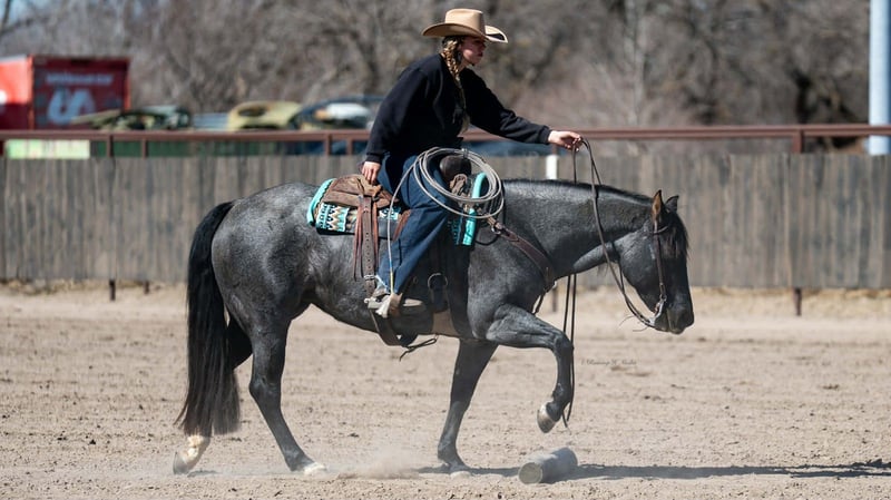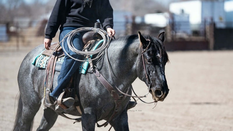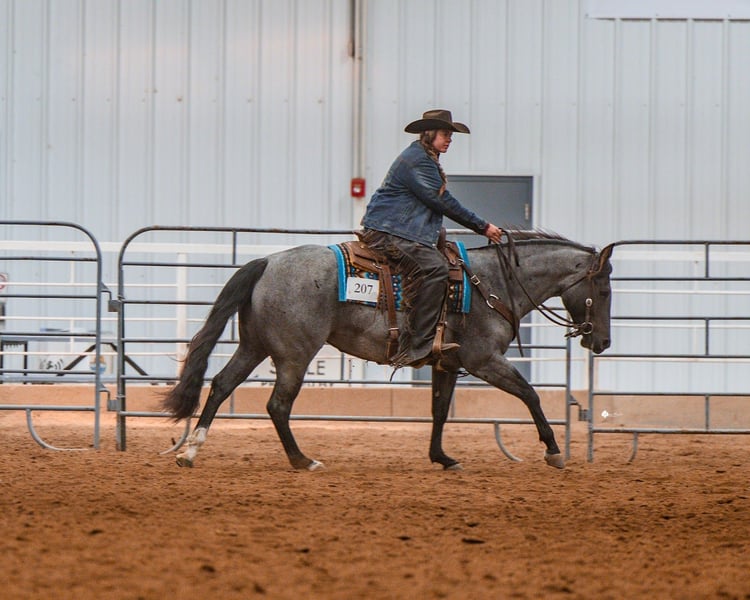 Zelda, yegua de 4 años, 1.65 m, azul roan, de la raza AQHA