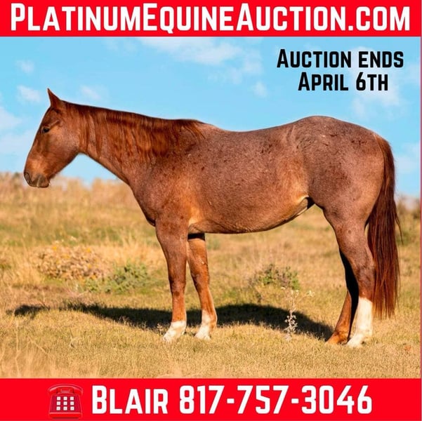 ONLINE AUCTION Place your bids at www.PlatinumEquineAuction.com Starting Bid $3500 Auction ends April 6th, 2025 Need a new saddle? Check out White Rock Saddles on our website or Facebook! Harley is a 15.1H, 3 yr old grade red roan mare and has been a personal horse for us since last 6 months! She came off a ranch in Nebraska and was started by the Amish. She’s already seen a ton of things by, drug calves on the ranch and been rode all over. She’d be a great day working, rope horse or all around prospect. Harley is athletic, EXTREMELY cowy and wants to please! She’s been started on the barrels, and will make a real prospect if you want to take her that way! She is gritty and will do absolutely anything you ask of her. She takes to new places great and rides like she has years of experience. She’ll neck rein, move off leg and she already has an incredible stop. Harley has been on our keeper list because of her raw talent and outstanding ability for being so young. We have agreed we have too many and she’s not getting the attention she deserves to go make something great! She loads, leads, ties and bathes good. Her only “vice” would be she’s watchy. She’s really only watchy on the ground, snorty at some things, but she’s all business in the saddle. Harley has never offered to buck, bolt, rear or do anything other than “walk the line” when on her back. Whoever ends up with this incredible mare will have one heck of a prospect on their hands and will be able to go do any job with her! She’ll be an incredibly nice addition to any string! Go to her website page northtexashorsecompany.com/harley for more pictures and footage! Please call Blair with North Texas Horse Company for more info at 817-757-3046. We are located in Weatherford, TX and can help arrange affordable shipping to anyone!! ONLINE AUCTION Place your bids at www.PlatinumEquineAuction.com Starting Bid $3500 Auction ends April 6th, 2025 Need a new saddle? Check out White Rock Saddles on our website or Facebook!