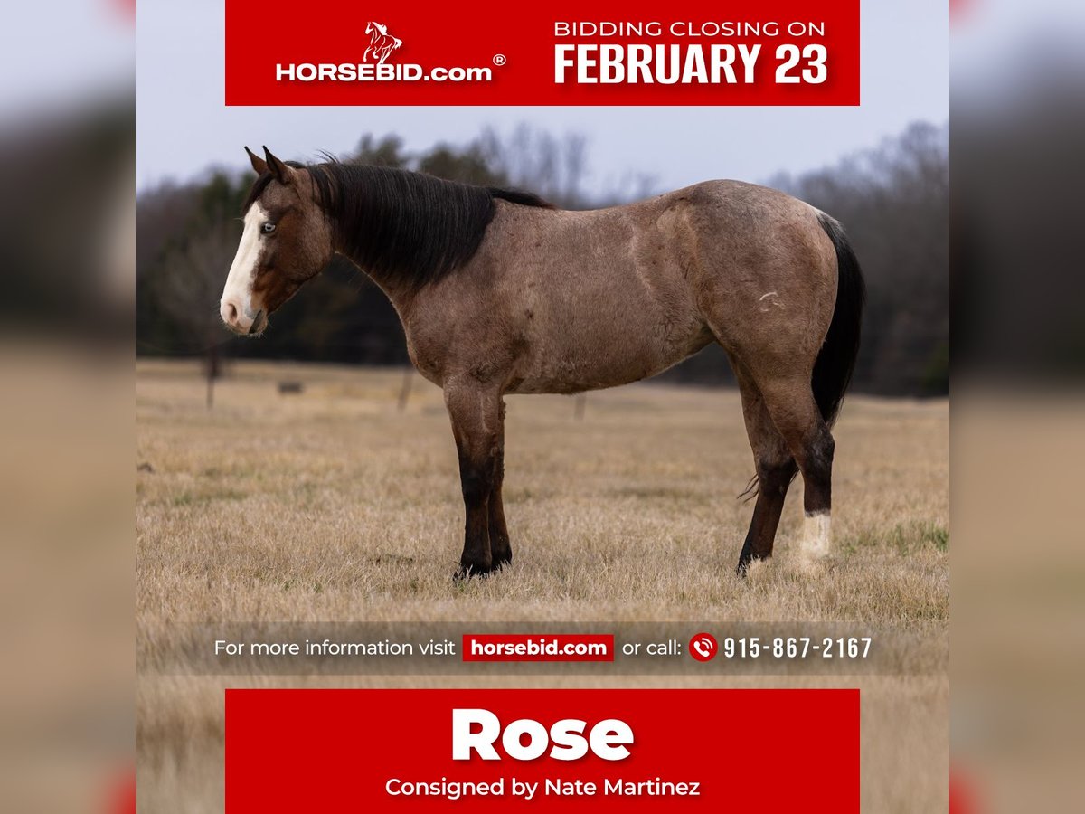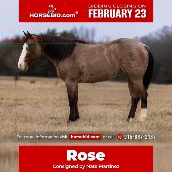 💎 𝐓𝐇𝐄 𝓓𝓲𝓪𝓶𝓸𝓷𝓭 𝐒𝐇𝐎𝐖𝐂𝐀𝐒𝐄 💎 Happening now thru MONDAY | FEBRUARY 23rd - Available EXCLUSIVELY on HorseBid's website! For more details and to register visit: www.Horsebid.com CONSIGNOR CONTACT: Nate Martinez 915-867-2167 LOCATION: Whitton, TX BREED: Quarter Horse REGISTERED: No REGISTERED NAME: Rose COLOR: Bay Roan HEIGHT: 14.2 AGE: 5 GENDER: Mare Rose is a beautiful 5-year-old, 14.2-hand mare with an exceptional mind and a standout presence. She is incredibly gentle and easy to work with, making her a pleasure both in and out of the saddle. Rose is super athletic, quick-footed, and naturally talented, with a very unique and eye-catching look that sets her apart. She is started extremely well on the heel side and has already had a lot of calves roped on her. Rose shows confidence, willingness, and a strong work ethic, making her a fantastic prospect for anyone looking for a reliable performance partner. If you’re not specifically searching for a performance horse, Rose is just as enjoyable outside the arena. She is great on the trails and ready for any adventure, whether it’s long rides, exploring new country, or simply being a dependable, fun mount. Rose is sound, requires no maintenance, and is ready to go in any direction. She combines athletic ability, a gentle disposition, and versatility — a rare find in a young mare.