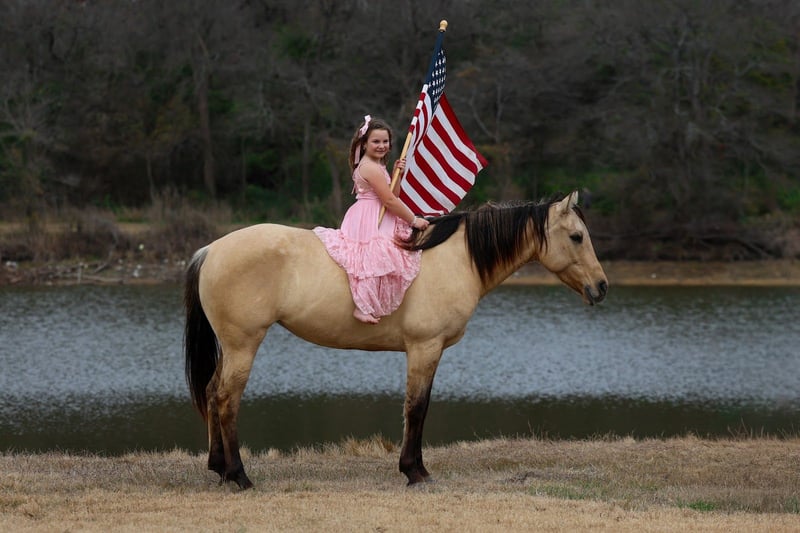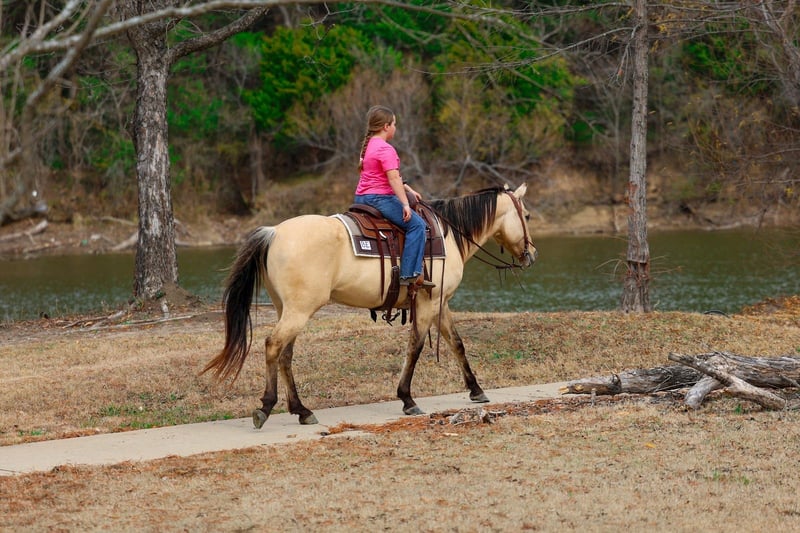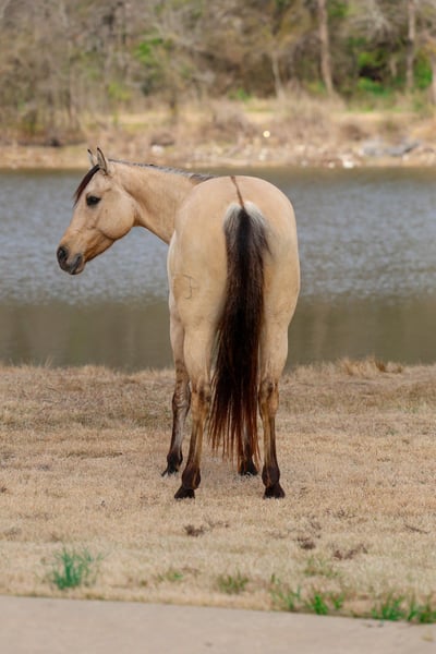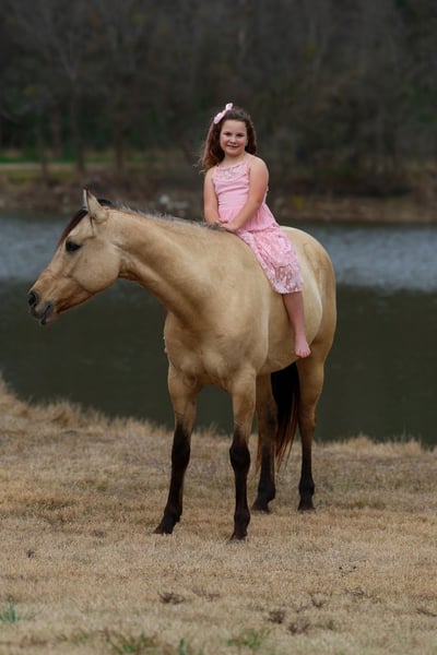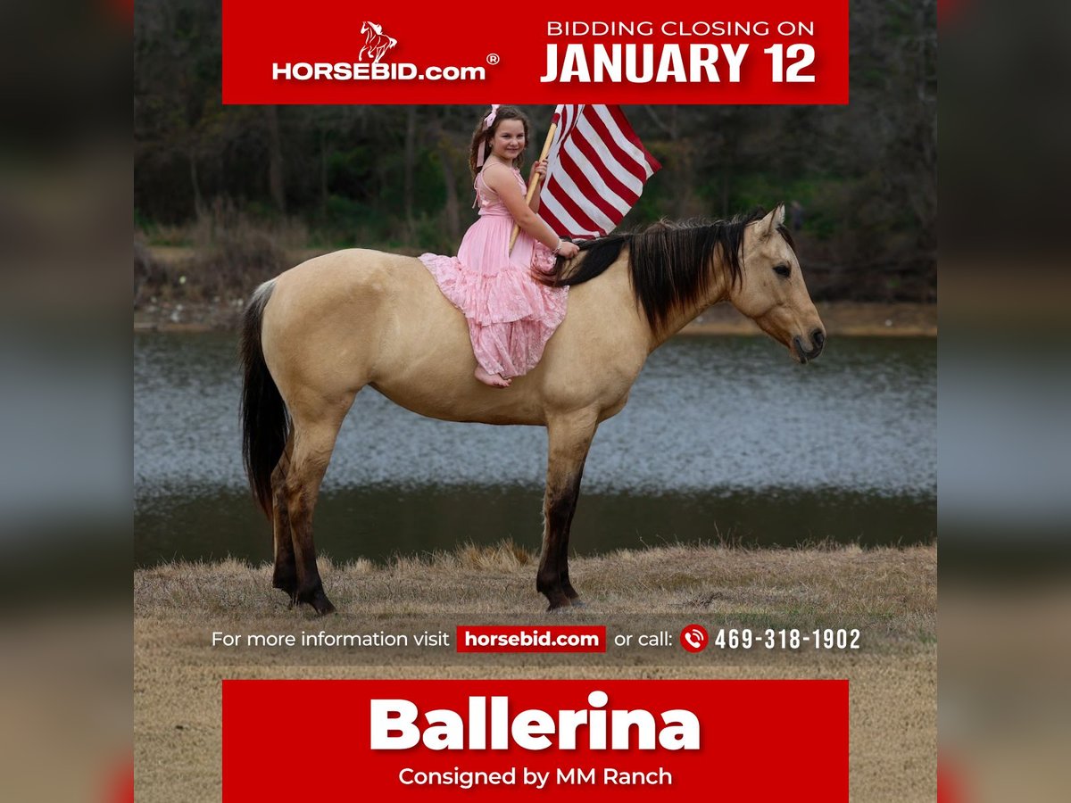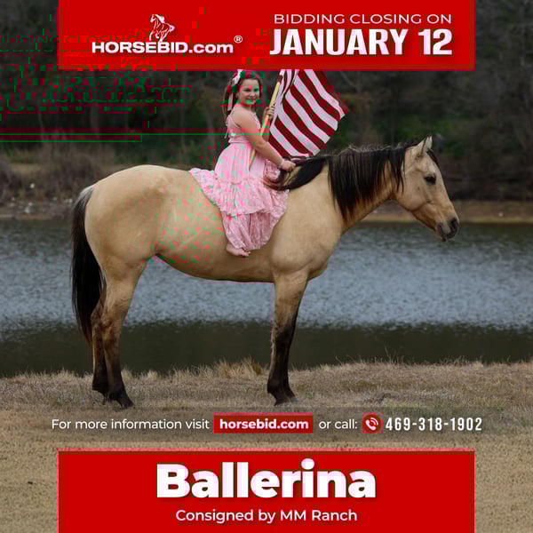♦️𝐍𝐄𝐖 𝐘𝐄𝐀𝐑'𝐒 𝑬𝒙𝒕𝒓𝒂𝒗𝒂𝒈𝒂𝒏𝒛𝒂♦️ Happening now thru MONDAY | JANUARY 12th - Available EXCLUSIVELY on HorseBid's website! For more details and to register visit: www.Horsebid.com CONSIGNOR CONTACT: MM Ranch 469-318-1902 LOCATION: Forney, TX BREED: Quarter Horse REGISTERED: No REGISTERED NAME: Ballerina COLOR: Buckskin Dun HEIGHT: 14.3 AGE: 5 GENDER: Mare 🩰 Meet Ballerina, 🩰 A true one of a kind. She is an absolutely GLAMOROUS little Buckskin Dun mare with gorgeous zebra stripes legs. She is standing at the perfect size of 14.3 hands tall. A once in a lifetime find and at just 5 yrs old she has her whole life in front of her. Yes, vet checked to be 5 yrs old. She has the most loving and kind disposition. She is naturally gentle and kind. Doesn’t have a mean bone in her body. Absolutely loves attention from any and everyone. Especially kids!!! Not even an ounce of spookiness. No snootiness or watchiness. Absolutely no bad habits. She is the ultimate sweetheart. Ballerina has a solid foundation in her training. Since she was 2 yrs old, she has been used on a ranch. She has so much ability and cow sense. She can go any direction. She is very talented, smart, and so easy to ride. This girl could stand in place and short lope. She is a very elegant mover. Her trot and lope is Effortless for her!! So smooth and easy. You barely have to squeeze to get her to step off in it. She has all the bells and whistles as they say!!! She is ready to go on and do big things. She has been rode both in and out of the arena. Rode out on the ranch and checked cattle and been on lots of trail rides. Even had a little roping done on her. You do not have to be a cowboy to ride her though. The best thing about her is she is absolutely safe and gentle for anyone. I have never seen this mare do anything wrong. No bad habits. Absolutely no quirks or vices about her. She perfect to be mounted. Stands perfect for baths. She will meet you at the gate every time. And comes right up to you. She wants to please and wants to learn. Absolutely NO warming her up. Just jump on her and go. She is safe for anyone to ride!!! She really has the capability to do anything you want to do on her and has her whole life in front of her. You will get noticed riding her. She is so pretty. We can and will help arrange affordable shipping if needed. She is up to date on all shots and worming. She just had her feet done. She is ready to go to her new home. Call with anymore questions you may have about Ballerina.