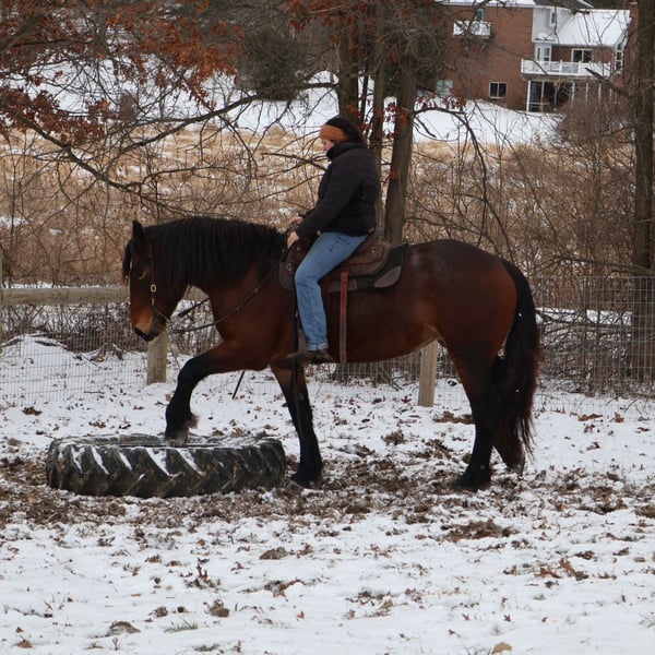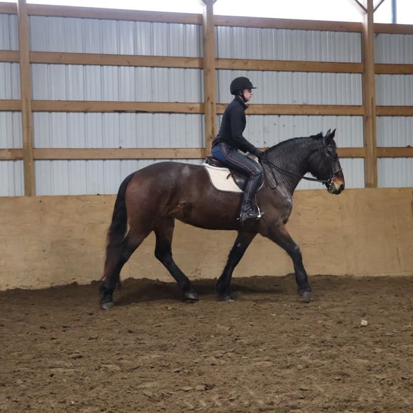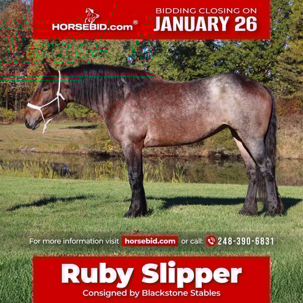 𝐉𝐀𝐍𝐔𝐀𝐑𝐘 ⭐️𝑨𝒍𝒍 𝑺𝒕𝒂𝒓 𝑳𝒊𝒏𝒆𝒖𝒑⭐️ Happening now thru MONDAY | JANUARY 26th - Available EXCLUSIVELY on HorseBid's website! For more details and to register visit: www.Horsebid.com CONSIGNOR CONTACT: Blackstone Stables 248-390-6831 LOCATION: Howell, MI BREED: Brabant Quarter Horse Cross REGISTERED: No REGISTERED NAME: Ruby Slipper COLOR: Bay Roan HEIGHT: 16.1hh AGE: 5 GENDER: Mare Ruby Slipper or Ruby as we call her around here is a 16.1hh bay roan Brabant Quarter Horse Cross. She is a solid made but yet very athletic girl. Ruby is 5 years old. Ruby is very well broke to walk, trot and canter. She is a total kitten in the barn and out in the pasture. She's playful and inquisitive while being calm and loving. Ruby is not the mareish type. She goes out in a group and plays well with all others while being easy to catch any day anywhere! Ruby has delightfully comfortable and balanced gaits. She has a quiet walk, a floaty trot and a canter you will melt right into, she takes both leads and her breaks are good! She comes equipped with all the flat work buttons you could want. She has also been started over fences and is doing amazing. Ruby has been through our whole desensitization program and passed every challenge with flying colors. She will walk-through pool noodles over bridges tarps. She will pull a sled and carry a flag. Out on the trails she will remain as levelheaded as they come take her for a gallop through a big open field or a walk in the woods. She's happy to do whatever you ask. She has been exposed to water wildlife and traffic all with no issues. She is also broke to drive. This is an all-around girl that will excel in anything from working equitation, to a trail horse or as a hunt horse, cross country mount or that all around horse the whole family can enjoy. You can take her out and have a blast but yet trust her when beginners come over to go for a ride! She's available for a private sale now!