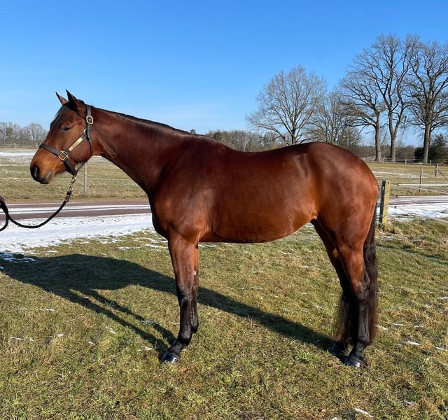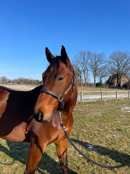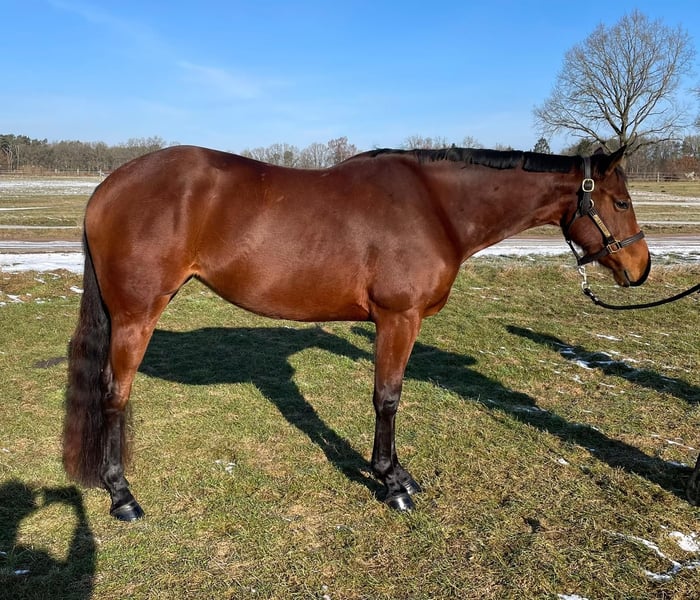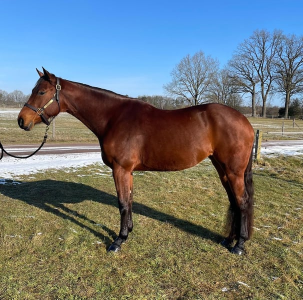 Pretty Diamond Eyez, aka Hazel, ist eine super talentierte Hunter Under Saddle/Allaround Quarter Horse Stute mit bester Abstammung, die ich durch die Veränderung meiner Lebensumstände leider verkaufen muss. Sie wurde von uns als Fohlen in den USA gekauft und nach Deutschland importiert. Sie durfte hier dann in Ruhe groß werden, bevor sie auf ihr Reitpferdeleben vorbereitet wurde. Hazel ist sehr sozial mit anderen Pferden, hat Geländeerfahrung, kennt Bodenarbeit und wird auf dem Platz und in der Halle geritten. Sie ist in das Jungpferdeprogramm der EWU einbezahlt und bereit für neue Herausforderungen. Hazel wurde bisher noch nicht auf Turnieren vorgestellt. Sie steht aktuell im Training bei Alexander Eck und kann dort bei ernsthaftem Interesse besichtigt und Probe geritten werden. Aufgrund ihres Alters ist Hazel kein Anfänger- oder Jugendpferd. Mit ihrer Abstammung ist sie ein Juwel für die spätere Zucht nach der Reitpferdekarriere. Vater: Easy On The Eyez AQHA World Champion NSBA BCF Ltd NP Champion Reserve Congress Champion Mutter: Spurz N Diamonds Congress Champion 2 x NSBA World Champion 3 x NSBA BCF Champion HUS Reichert Champion Hazels Halbbruder mütterlicherseits, „The Luxury Line“, ist AQHA World Champion und Congress Champion.