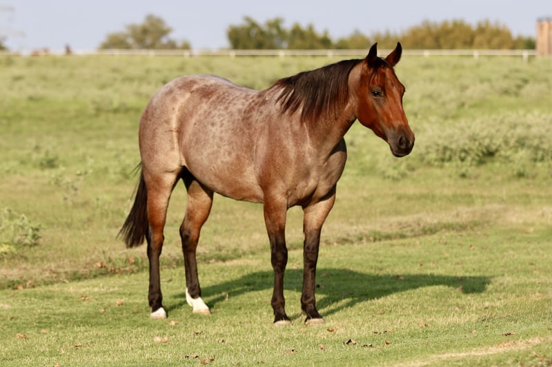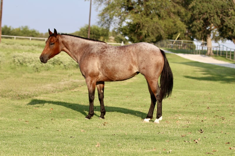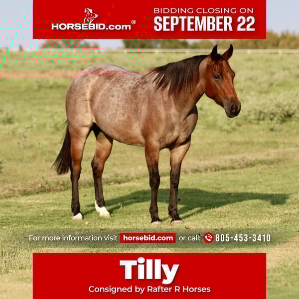 🍁𝒕𝒉𝒆 𝐅𝐀𝐋𝐋 𝑺𝒑𝒆𝒄𝒕𝒂𝒄𝒖𝒍𝒂𝒓🍁 Happening now thru MONDAY | SEPTEMBER 22nd - Available EXCLUSIVELY on HorseBid's website! For more details and to register visit: www.Horsebid.com CONSIGNOR CONTACT: Rafter R Horses 805-453-3410 LOCATION: Decatur, TX BREED: Quarter Horse REGISTERED: Yes REGISTERED NAME: Chiripa COLOR: Bay Roan HEIGHT: 14 AGE: 5 GENDER: Mare I am going to show you the cutest bay roan mare you have ever seen! Tilly is as nice as they come. Standing at 14.1 hands tall and is a deep bay roan color. Not only is Tilly cute as can be she is a classy lady. This mare has the best personality in the world. She wants to be your best friend! Tilly is the first horse in the pasture to meet you at the gate! Tilly absolutely adores the kids and will follow them anywhere they go. Tilly is the definition of broke. This mare is truly one hand broke and has a rocking chair lope. Tilly has a nice flat turn around and a cute stop. Her lead departures are super smooth making her easy for anyone to operate and enjoy! Tilly will do any job you ask of her. She is a jack of all trades. Tilly has been used all over the ranch to check fences and has been used extensively in the feed yard. With that experience under her belt she is a phenomenal trail horse and will step over any obstacle in your way without any hesitation. Tilly has all the tools to make a jam up junior rodeo horse for a family wanting a little all around horse. I have lightly introduced her to the barrel pattern and she seems to enjoy it. We have started roping the sled on her and she acts like an old seasoned veteran. This mare has all the right buttons you could ask for. You can turn her on then the kids can ride her and she will slow right down. Beginner kids can easily guide her around and she takes care of them every step of the way. Tilly would walk through fire for her person! This mare is super special around this barn and only being 5 years old she has her whole life ahead of her. Tilly is looking for her forever partner! For more information please call Rachel at 805-453-3410.