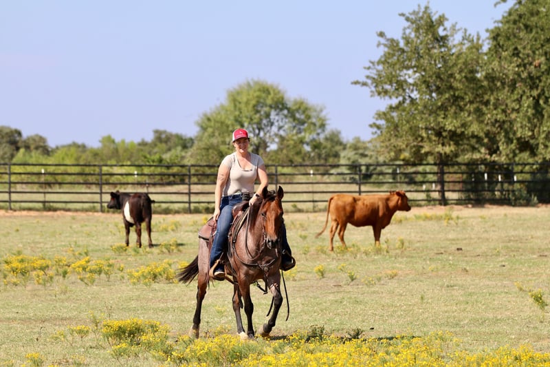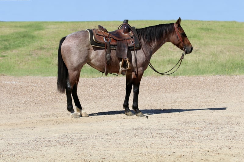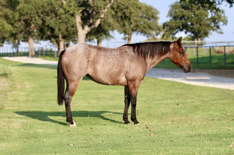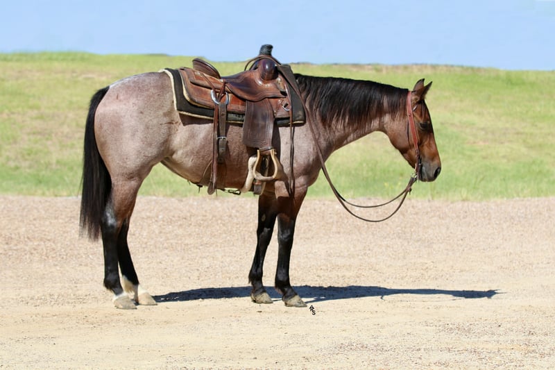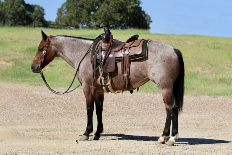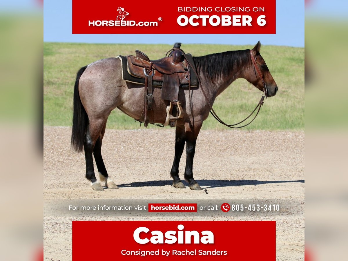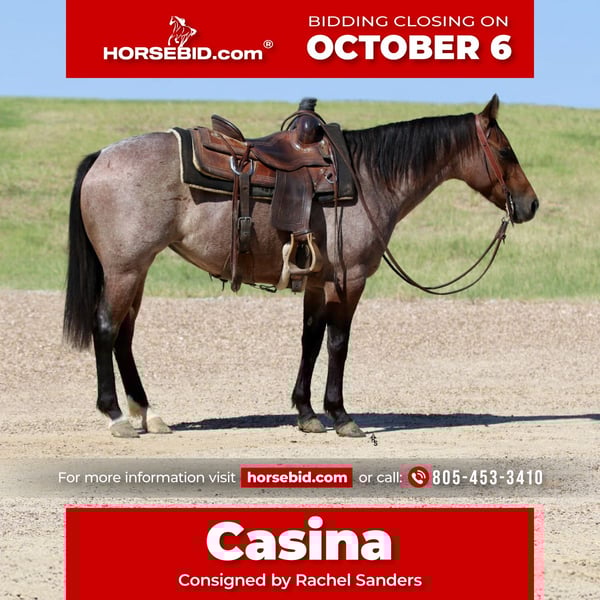 🍂 𝓐𝓾𝓽𝓾𝓶𝓷 𝑨𝑳𝑳 𝑺𝑻𝑨𝑹 𝑳𝑰𝑵𝑬𝑼𝑷 🍂 Happening now thru MONDAY | OCTOBER 6th - Available EXCLUSIVELY on HorseBid's website! For more details and to register visit: www.Horsebid.com CONSIGNOR CONTACT: Rachel Sanders 805-453-3410 LOCATION: Decatur TX BREED: Quarter Horse REGISTERED: Yes REGISTERED NAME: Chiripa COLOR: Bay Roan HEIGHT: 14 AGE: 5 GENDER: Mare I am going to show you the cutest bay roan mare you have ever seen! Casina is as nice as they come. Standing at 14 hands tall and is a deep bay roan color. Not only is Casina cute as can be she is a classy lady. This mare has the best personality in the world. She wants to be your best friend! Casina is the first horse in the pasture to meet you at the gate! Casina absolutely adores the kids and will follow them anywhere they go. Casina is the definition of broke. This mare is truly one hand broke and has a rocking chair lope. Casina has a nice flat turn around and a cute stop. Her lead departures are super smooth making her easy for anyone to operate and enjoy! Casina will do any job you ask of her. She is a jack of all trades. Casina has been used all over the ranch to check fences and has been used extensively in the feed yard. With that experience under her belt she is a phenomenal trail horse and will step over any obstacle in your way without any hesitation. Casina has all the tools to make a jam up junior rodeo horse for a family wanting a little all around horse. I have lightly introduced her to the barrel pattern and she seems to enjoy it. We have started roping the sled on her and she acts like an old seasoned veteran. This mare has all the right buttons you could ask for. You can turn her on then the kids can ride her and she will slow right down. Beginner kids can easily guide her around and she takes care of them every step of the way. Casina would walk through fire for her person! This mare is super special around this barn and only being 5 years old she has her whole life ahead of her. Casina is looking for her forever partner! For more information please call Rachel at 805-453-3410.